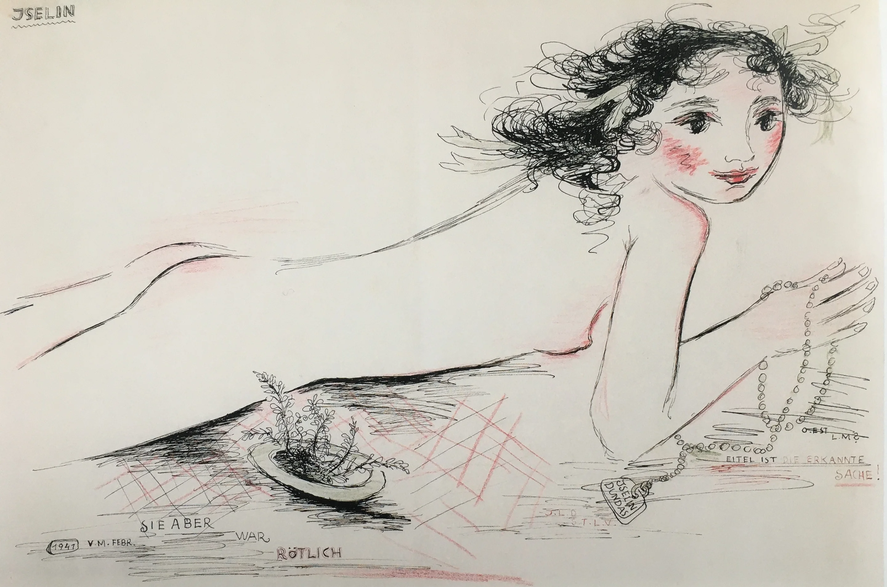 Eine Zeichnung von bezaubernder Schönheit zeigt in feinen Strichen eine liegende nackte junge Frau mit schwarzen Locken, Augen wie schwarze Kirschen und leuchtend roten Wangen. In den Händen hält sie eine Perlenschnur, an der ein Täfelchen mit der Inschrift „JSELIN DUNDAS“ hängt.