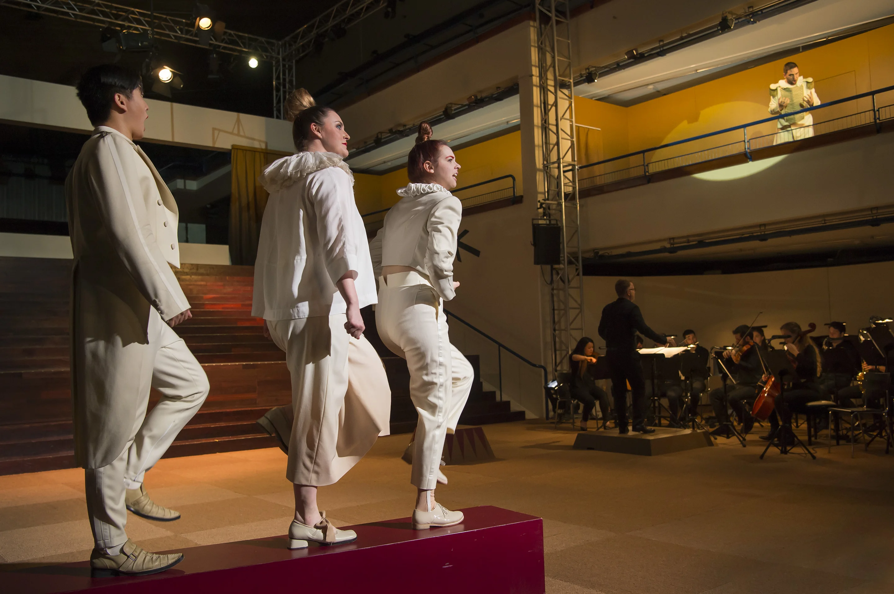 Die Basler Einrichtung und Inszenierung lag in den Händen der jungen österreichischen Regisseurin Katrin Hammerl, welche, wie auch schon früher bewiesen, eine eher stille, behutsame, aber gerade deshalb spannungsgeladene Regiesprache führt. „Für mich ist das Werk zeitlos und überzeitlich.“ Das wird auch durch die Schlichtheit der Spielfläche im Foyer des Grossen Basler Hauses betont sowie durch die Wahl der zeitlos harlekinesken Kostüme (Bühne und Kostüme: Lisa Dässler).
