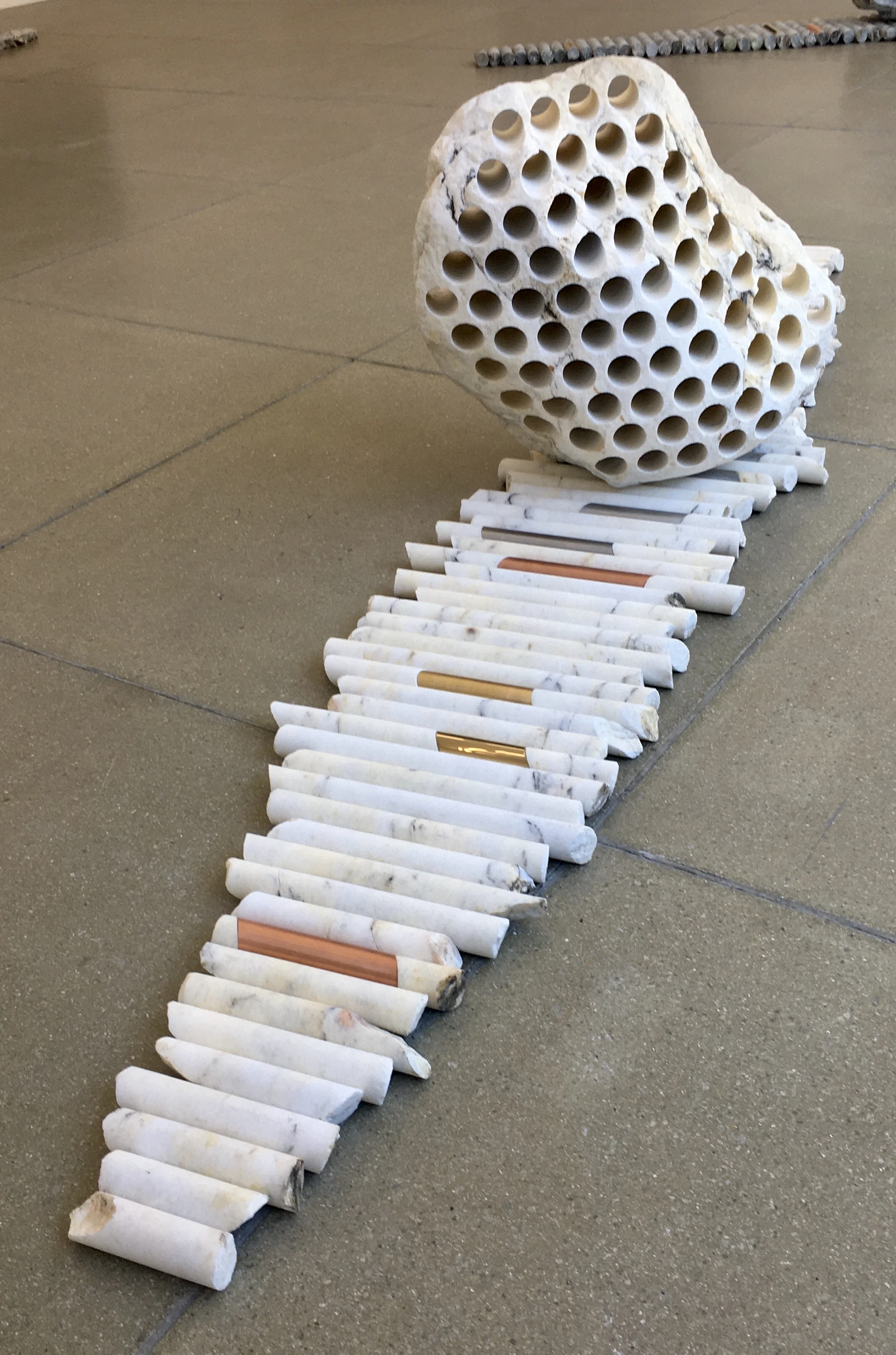 Weissbraune Salzsteine bilden sechseckige Türme, in die Charrière transparente Behälter mit Lithium-Sole einfügt. Die Sole braucht man für die Akkus elektronsicher Geräte. Salz und Sole stammen aus dem Salar de Uyuni in den bolivianischen Anden, wo sich das weltweit grösste Lithium-Vorkommen befindet. So macht der Künstler auf die Folgen des Abbaus auf die örtlichen ökologischen Gegebenheiten aufmerksam. Er sucht im Maggiatal nach Findlingen, die er in ornamentaler Anordnung durchbohrt. Die runden Bohrkerne legt er so aus, dass sich die Gesteinsbrocken auf ihnen fortbewegen liessen. Die Findlinge selber, Steine auf Wanderschaft, bezeugen, dass das Erdgeschehen stetig fortschreitet und dass es keinen Stillstand gibt. Die Bohrkerne, die zum Teil in Gold oder Silber gefasst sind, verweisen auf die ständigen Eingriffe des Menschen in die Natur und die Aneignung von gefundenen Rohstoffen durch die Menschen.