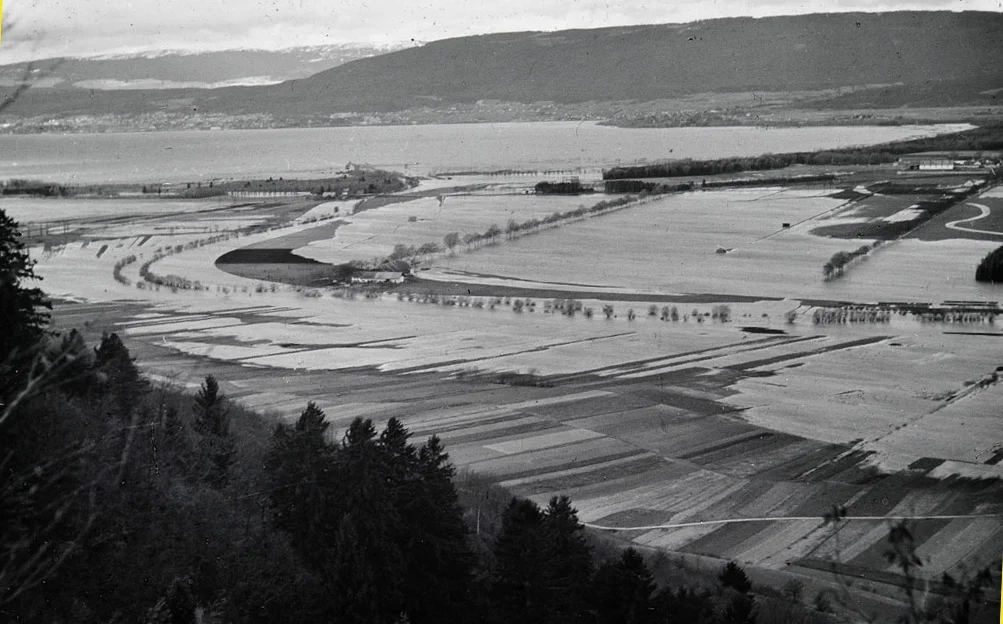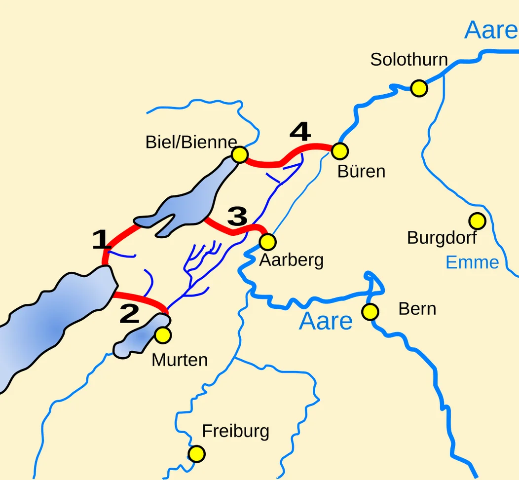 Ein erstes Projekt, um die immer schlimmer werdenden Überschwemmungen unter Kontrolle zu bringen, welche jeweils bis vierzig Prozent des Kulturlandes zwischen dem Broyetal südwestlich des Murtensees und dem Aaretal bis hinunter nach Solothurn und das Seeland unter Wasser setzten und der Landwirtschaft enormen Schaden zufügten, wurde bereits 1704 ausgearbeitet. Aber es vergingen rund 150 Jahre, bis 1868 die Arbeiten an der sogenannten Ersten Juragewässerkorrektion aufgenommen wurden. Sie war 1891 vollendet.