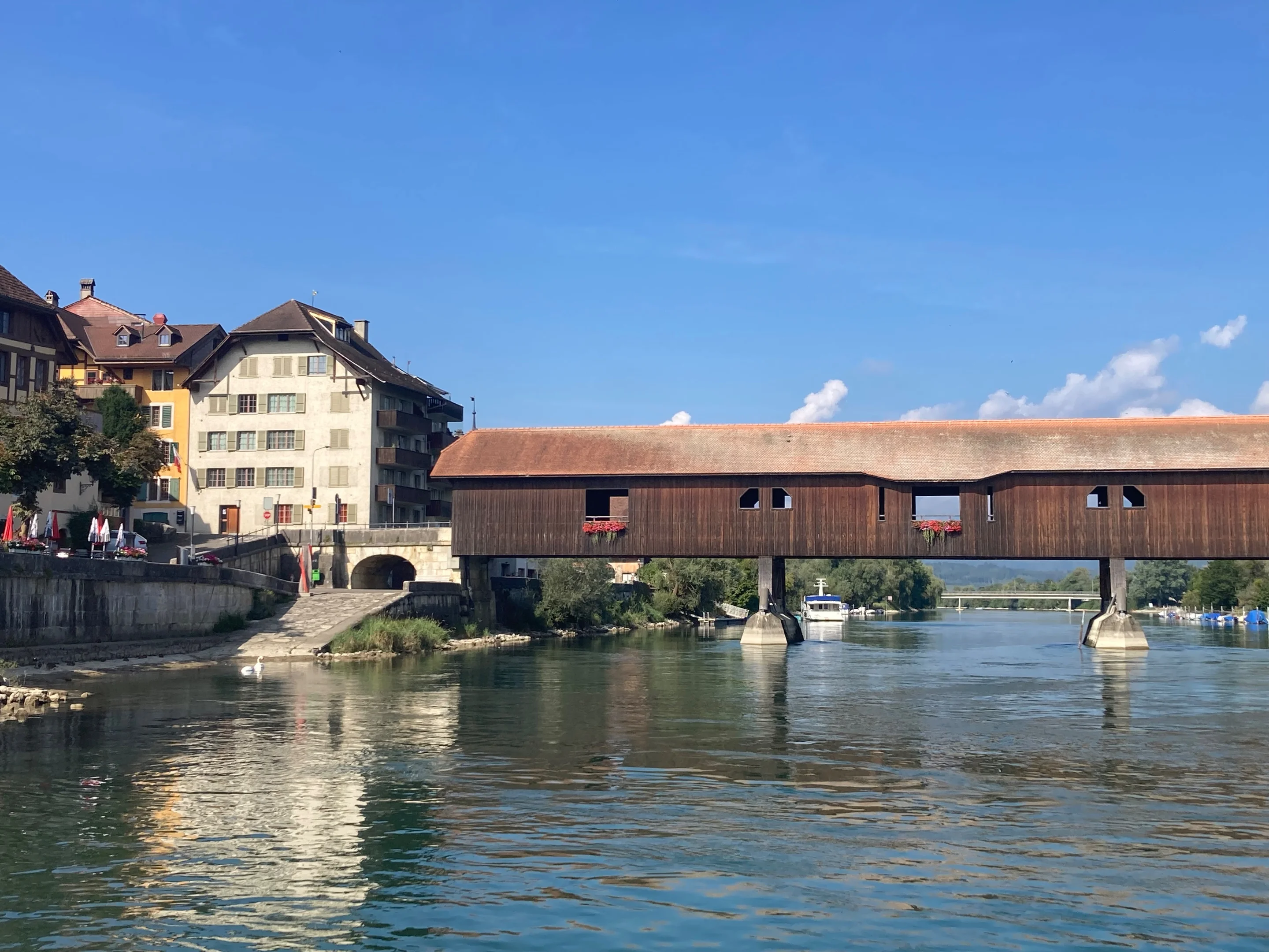 Uns fällt die grosse Zahl von Schiffen auf, darunter viele teure Yachten, welche oberhalb von Solothurn in einem grossen Hafen liegen oder an beiden Ufern je zwischen zwei Pfählen festgemacht sind. Unvorstellbar, wenn an einem schönen Wochenende im Sommer ihre Besitzer alle hinauf zum Bielersee fahren wollen. Vielleicht bleibt das Chaos nur deswegen aus, meint Daniel, weil die meisten Hobby-Kapitäne ihre Schiffe kaum benützen, aber dennoch nicht daran denken, diese zu verkaufen, weil damit auch der Liegeplatz, auf den man so lange gewartet hat, verloren ginge. Wenn er sich vorstelle, dass im Winter all diese Schiffe aus dem Wasser müssen! – «Müssen sie aber nicht, die Aare gefriert nicht», höre ich den älteren Herrn sagen, der mit seiner Frau vor uns Platz genommen hat. – Wir realisieren, dass wir mitten unter einheimische Wasserspezialisten geraten sind und man sehr genau hinhört, was auswärtige Laien über «ihren» Fluss so daherplaudern.