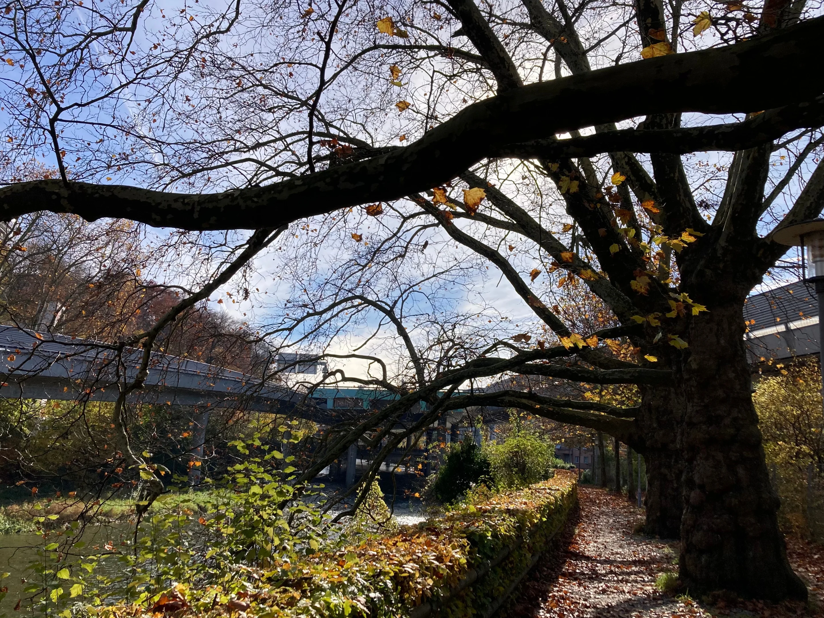 Doch davon später. Hinter einer Flussbiegung, wo am rechten Ufer zwischen den Bäumen die Therme von Zürich in der ehemaligen Brauerei Hürlimann auftaucht, kommt uns auf unzähligen dünnen Beinen im Fluss ein Ungeheuer entgegen. Jemand scheint ihm mit einem riesigen Schwert die Schnauze abgehauen zu haben. Beim Näherkommen entpuppt sich das Monster als das abrupte Ende einer Autobahnbrücke. Man fragt sich, welcher Held hier die Stadt vor grösserem Unheil bewahrt hat.