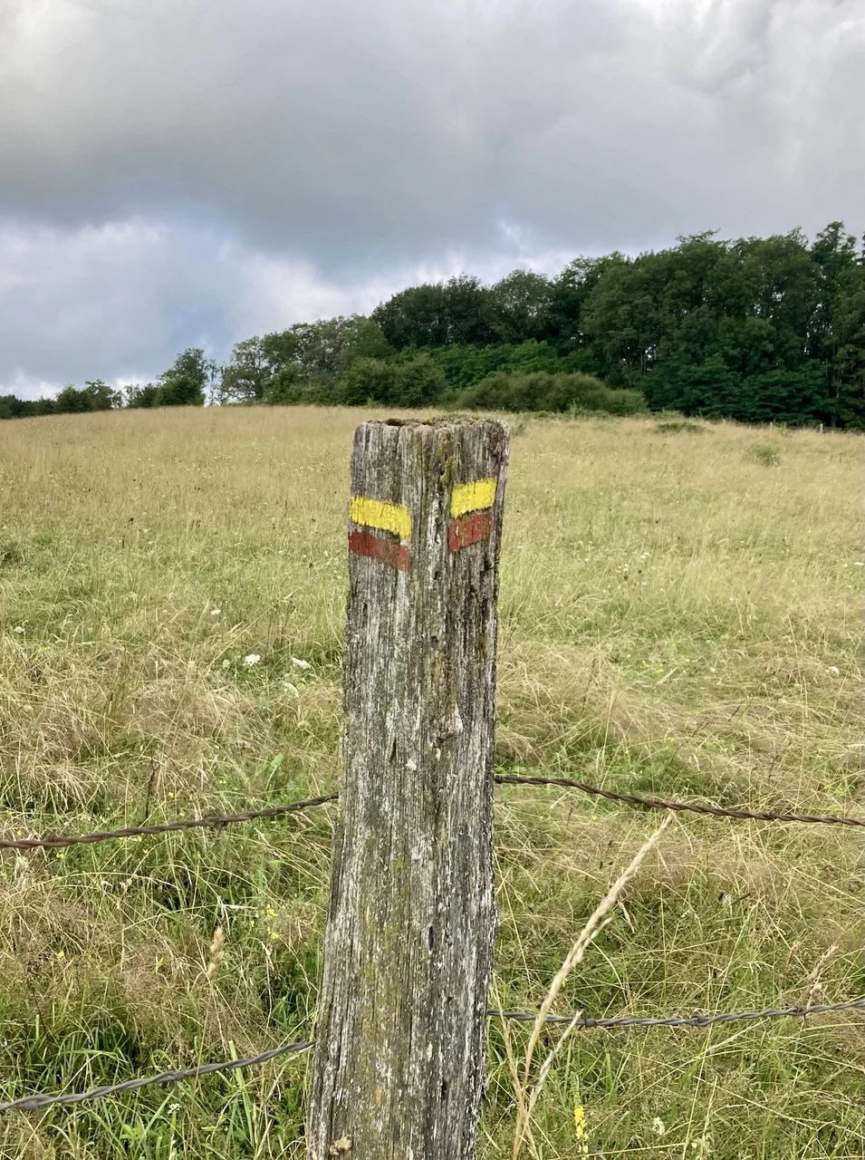 So liegt es nahe, dass wir unseren Morgenspaziergang – gleichsam „A la recherche du temps perdu“ – auf dem Chemin du Tunnel beginnen. Wir fühlen uns wie in einem begehbaren Bilderalbum, das uns mit unserem Leben und mit den Menschen verbindet, die darin wichtige Rollen spielten und noch immer spielen. Tatsächlich: Vom Pfosten eines Stacheldrahtzaunes leuchtet uns schon von weitem eine rot-gelbe Wegmarkierung entgegen, ein Zeichen der Erinnerung an einen Menschen, das ihn um Jahre überdauert hat und für einen kurzen Augenblick der Besinnung in unser Leben zurückbringt. „Wir wandern auf deinen Spuren, lieber Felix“, sagen wir uns im Stillen.