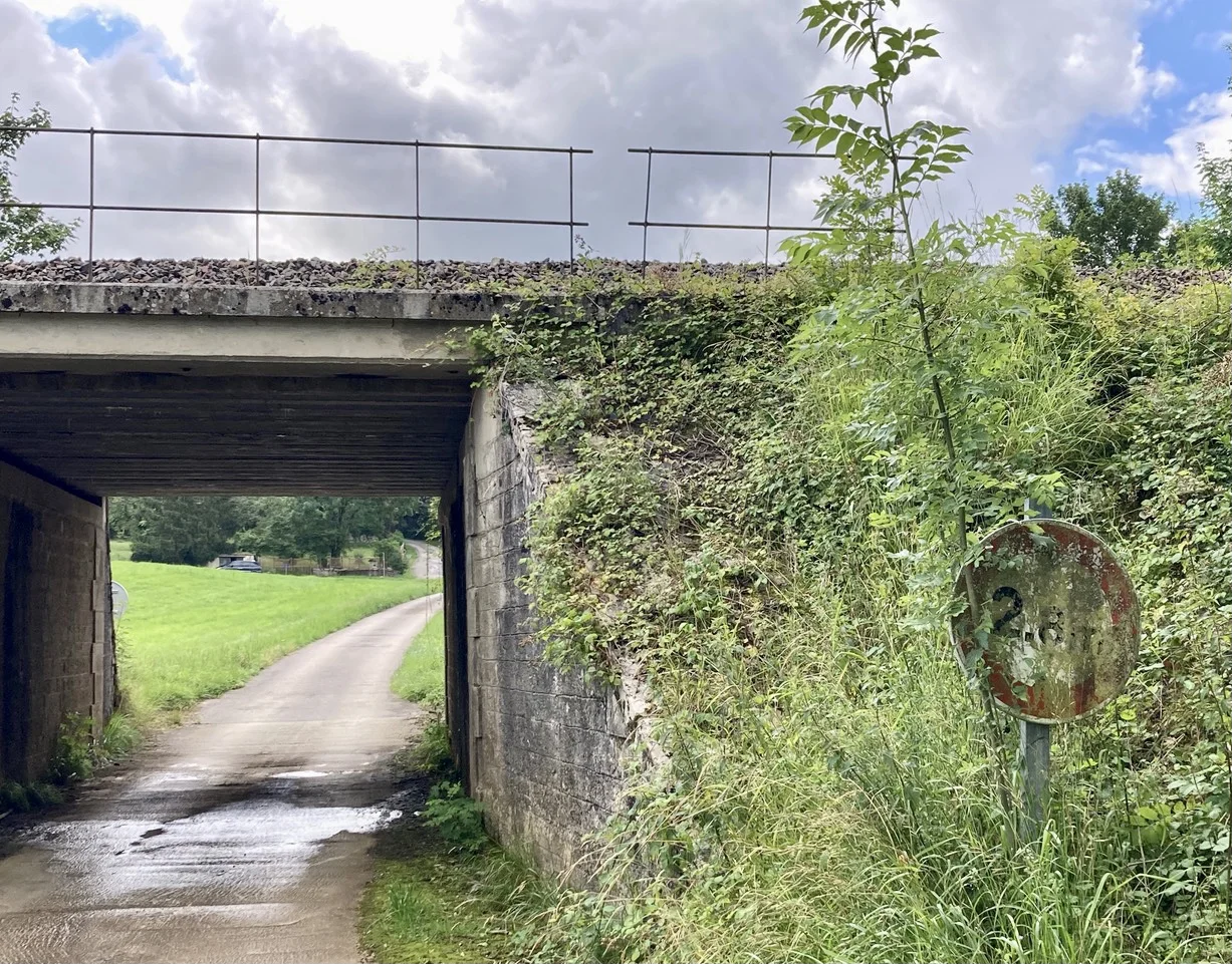 Der Rückweg führt auf einem schmalen Strässchen durch den Wald. Kurz vor Saint-Lamain kreuzen wir wiederum die Bahn, diesmal in einer schmalen Unterführung. Ein im Laufe der Zeit als Folge der nicht zu bändigenden Vitalität der lebendigen Natur unleserlich gewordenes Strassenschild warnt vor einer Begrenzung, die nur noch zu erahnen ist. Irgendwo in den Registern einer staatlichen Behörde muss dieses Schild vergessen gegangen sein, vergessen wie einst die Bahnlinie, welche über die Brücke führt. Sie – die Bahnlinie – war, wie die meisten Bahnen im Jura, im Zuge der TGV-Euphorie der 1970er- und 1980er-Jahre bereits dem Untergang geweiht, wurde dann aber doch gerettet, ja aufgewertet und gar elektrifiziert.