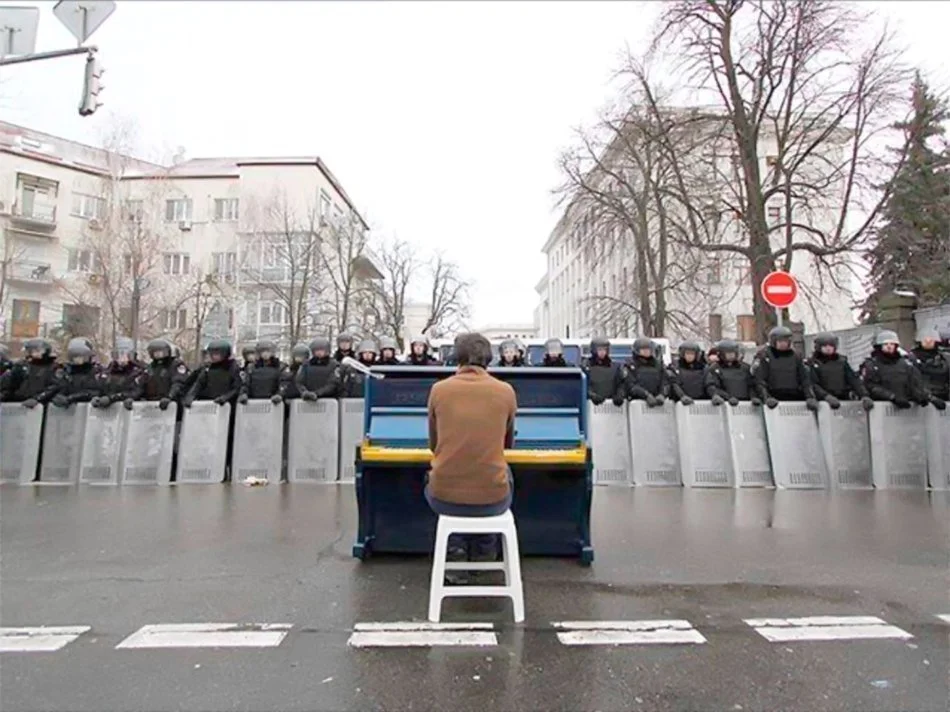 Ich hatte das Glück, Anfang Januar 2014 mich auf diesem zentralen Platz Kievs aufzuhalten, also zu einem Zeitpunkt zwischen dem brutalen Einsatz der Sonderpolizei Berkut gegen weit überwiegend friedliche Teilnehmer, vor allem Studenten im November/Anfang Dezember und der Gewalteskalation im Februar zwischen der Berkut, unterstützt von zivilen Schlägertrupps («Tituschki/титушки»), und inzwischen gut bewaffneten und gewaltbereiten, zum Teil rechtsextremen Demonstrantengruppen, aus welcher in undurchsichtiger Weise die vielen Todesopfer und überraschend schnell der Regierungsumsturz hervorging. Der anarchistische Zug der Ukraine hatte sich hier auf kleinem Raum, diskret eingeschlossen im weiten Umkreis durch die abwartende Polizei, eine Verkörperung geschaffen.