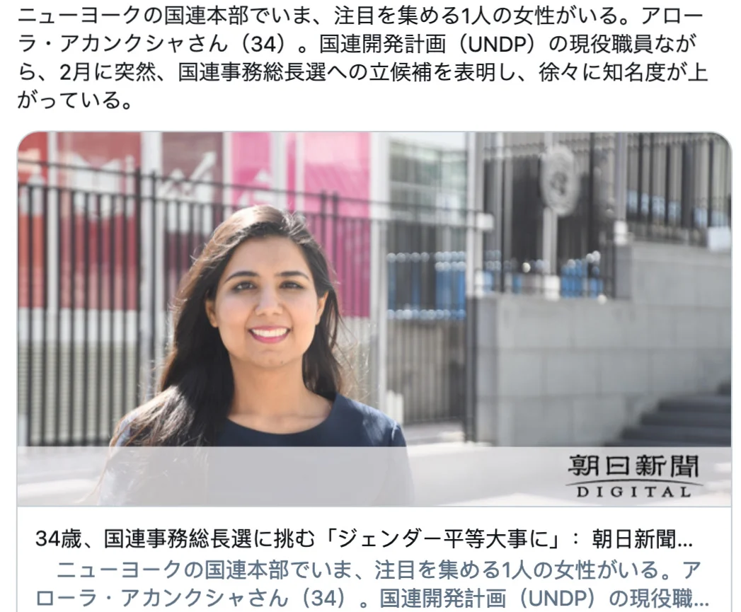 So staunten denn viele, als sie im Februar dieses Jahres offiziell ihr Bewerbungsschreiben einreichte. „I am Arora Akanksha. I am 34 years old and I am running for Secretary-General of the United Nations“, schreibt sie auf Twitter. Würde sie gewählt, wäre sie die erste Frau an der Spitze der Weltorganisation. Alle bisherigen neun Uno-Chefs waren Männer. Der Jetzige ist mehr als doppelt so alt wie sie.