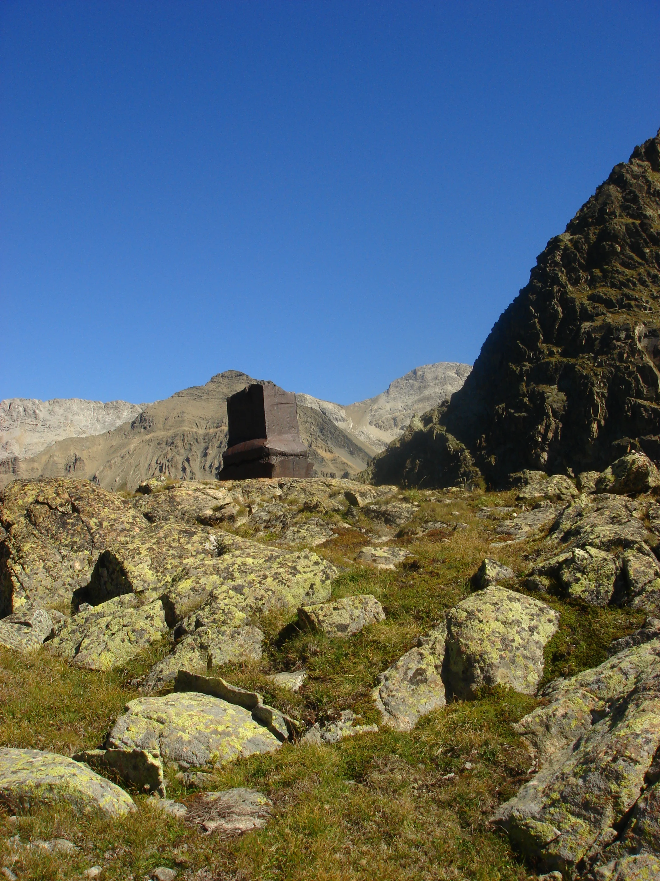 Doch zurück zur Säule, die keine ist. In der Beschreibung dieses Werks vermerkt Niederer, er habe während Jahren d i e Wasserscheide zwischen Schwarzem Meer und Nordsee gesucht. Die Wasserscheide? Das tönt etwas merkwürdig; solche Wasserscheiden gibt es in den Bündner Bergen unzählige. Aber Niederers Sinn stand nicht nach irgendeiner Wasserscheide, er wollte d e n Wasserscheide-Punkt finden, der für ihn stimmte. Und er fand ihn westlich des pyramidenförmigen Dschimels, in der Nähe von Punkt 2543, in völliger Weglosigkeit. Das war Ende der 1980er Jahre.