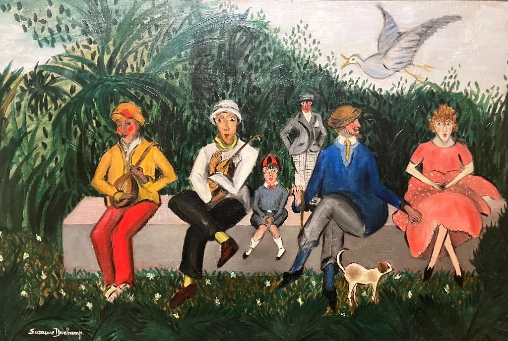 1922: Das ist die Zeit ihres abrupten Wechsels von Dadaistischem und Surrealistischem zu einer anekdotischen und teils auch autobiographischen Figuration. Wir sehen ein Hochzeitspaar vor uns, einen jungen Mann («Le garçon qui se crois marin»), eine «Soubrette dans le jardin» oder, fein säuberlich, auf einer Gartenbank sitzend, eine sommerliche Gesellschaft (Bild ganz oben). 1924 malt sie in «Le paradis terrestre» Adam und Eva inmitten lammfrommer wilder Tiere. Es folgen heitere Strandszenen oder zwei weibliche Akte in einem Interieur (1939) und attraktive Ausblicke in üppige Landschaften von mitunter flammender Farbigkeit.