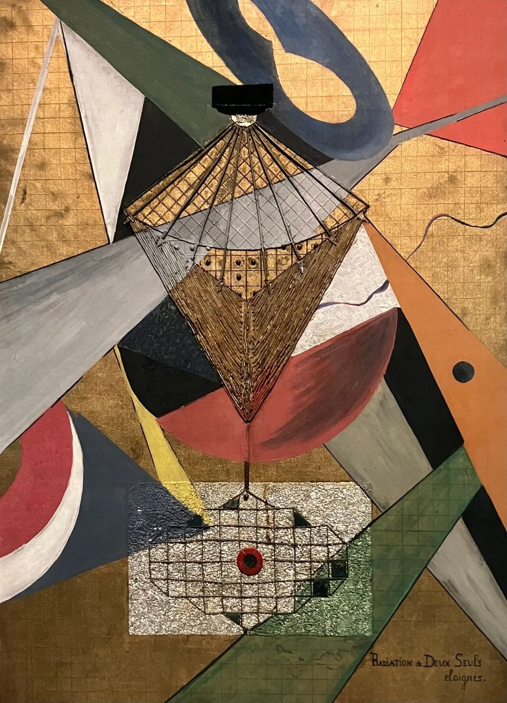 Die Ausstellung in den Parterre-Räumen des Kunsthauses Zürich ist chronologisch aufgebaut und wartet zu Beginn mit jenen Papierarbeiten auf, die meist kleinformatig sind. Man kann sie jenen aus dem Kreis von Marcel Duchamp, Francis Picabia und Dada ähnlich empfinden. Im Katalog ist denn auch ein Text mit «Ein Schüler von Duchamp, Picabia und Dada» überschrieben, obwohl die Schwester von Marcel Duchamp in der Ausstellung kaum als Nachfolgerin, Schülerin oder gar als Nachahmerin seiner Strategien und künstlerischen Innovationen zu erleben ist. Zwar könnte es so scheinen, denn es finden sich in ihren Malereien wie in «Radiation de deux seuls éloignés» (1916–1920) wohl Motive, die sich auch bei Marcel Duchamp finden liessen wie zum Beispiel Drehungen, Rotationskörper, Auffächerungen. Ebenso bezieht Suzanne Duchamp, ähnlich wie ihr Bruder, erfindungsreich verschiedene Materialien wie Glasperlen, Wachs und Schnur in ihre Arbeit ein und weitet damit ihre Möglichkeiten malerischer Praxis experimentierfreudig aus. Ähnlich geht sie zum Beispiel in der grossen Papier-Arbeit «Un et une menacé» vor, in die sie Teile eines Uhrwerkes, ein Senkblei und weitere Fundgegenstände einarbeitet.