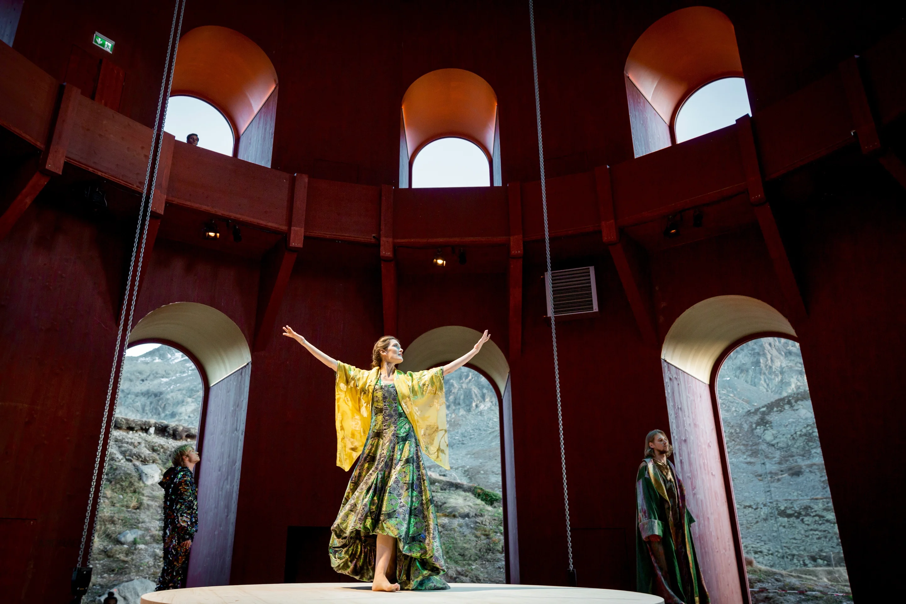 Eine von Kitsch befreite Weihnachtsgeschichte zu Musik von Schostakowitsch, hat Netzer vor wenigen Monaten versprochen. „Herodes“ ist als Stück und Inszenierung die erste Uraufführung auf der Passhöhe zwischen Surses und Engadin. Der vieleckige hölzerne Turm mit den hohen Bogenfenstern ist dreissig Meter hoch. Der Boden seiner Dachterrasse mit der herrlichen Aussicht bringt die Passhöhe von 2284 auf 2313 Meter über Meer. Das hat mit Sicherheit kein anderer Theaterbau geschafft – einen Pass höher zu machen, als er schon ist, dazu einen aus der Antike, mit Säulenstümpfen eines römischen Heiligtums zu beiden Seiten der Passhöhe. Im kleinen antiken Heiligtum aus Stein opferten die Händler den Göttern des Wegs und der Reise. Der moderne Holzbau dient den Musen des Theaters, von Gesang, Tanz, Musik. Doch unumschränkter Regent ist der donnernde Göttervater Zeus – der Turm ist nicht nur berauschend, er ist gewaltig.