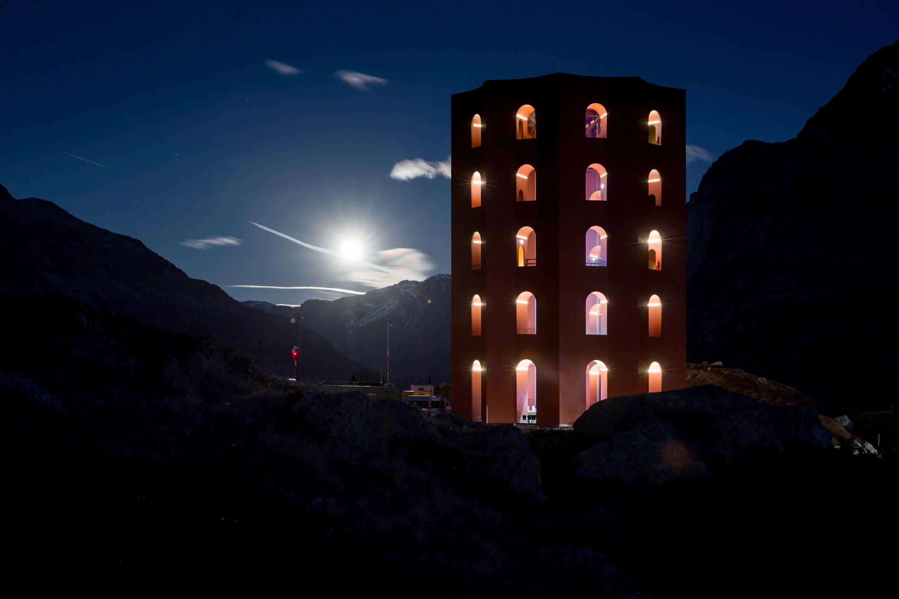 Die Kraft des roten Turms springt bei der Anfahrt auf beiden Seiten des Passes ins Auge, von Norden im letzten Moment, von Süden in längerer Gerade. Es ist ein Wehrturm für Graubünden, ein Wahrzeichen der innovativen Schweiz. Seine Gewalt ist noch nicht erkannt. Sie hat sich am „Herodes“-Premierenabend ein erstes Mal entfaltet. Der rote Turm ist das Bühnenbild unserer Welt, in Schönheit wie in Grausamkeit.