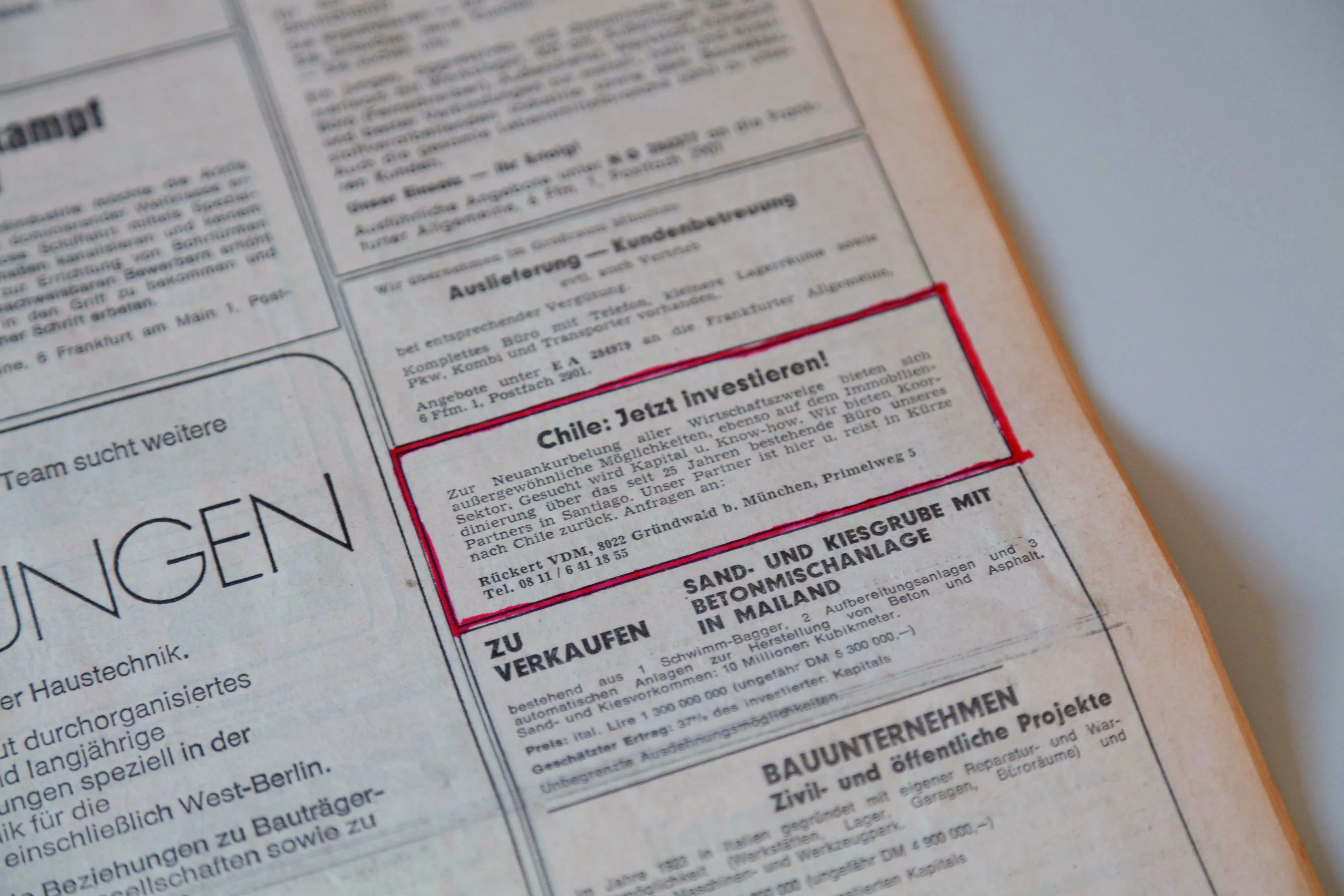 Unter den schweizerischen Positionen sticht vor allem das Projekt von RELAX (chiarenza & hauser & co) „invest & drawwipe“ hervor, das sich den chilenischen Ereignissen von 1973 von der europäischen Seite her annähert. Im Zentrum der Installation steht ein Zeitungsinserat der Frankfurter Allgemeinen Zeitung vom 21. September 1973, in dem „zur Neuankurbelung aller Wirtschaftszweige“ geworben wird: „Chile: Jetzt investieren!“ Der Zynismus der kurz darauf aufkeimenden europäischen Neoliberalisierung wird durch ein Plakat von Margreth Thatcher manifest, die – in hollywoodhafter Aufmachung – siegesgewiss „The Conservative manifeste 1979“ hochhält.