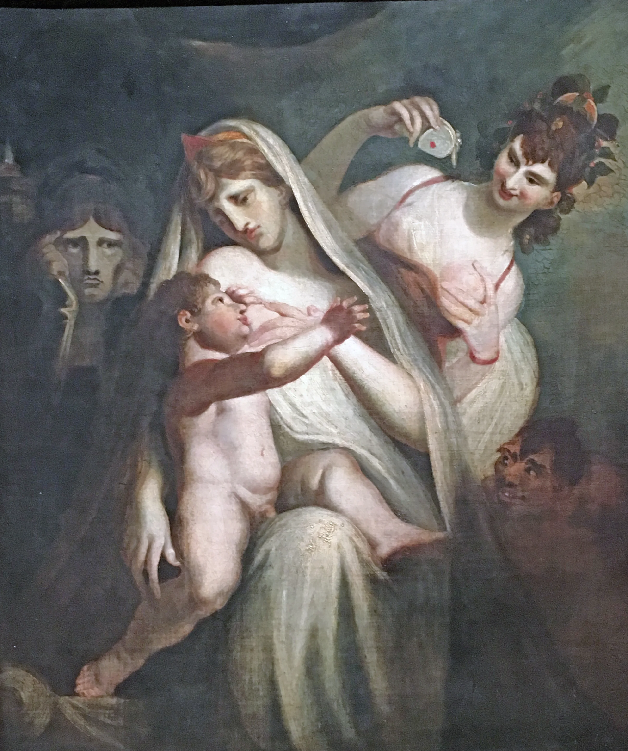 Zwei Frauen kümmern sich um einen nackten Buben. Jene links mit düsterem Gesicht ist verschleiert und bietet dem Buben die Brust. Jene rechts lächelt, lockt den Buben mit einem Schmetterling und will ihm ebenfalls die Brust bieten. „Shakespeare als Kind zwischen Tragödie und Komödie“ – so der Titel der Malerei – ist mehrfach typisch für Füssli (1741-1825).