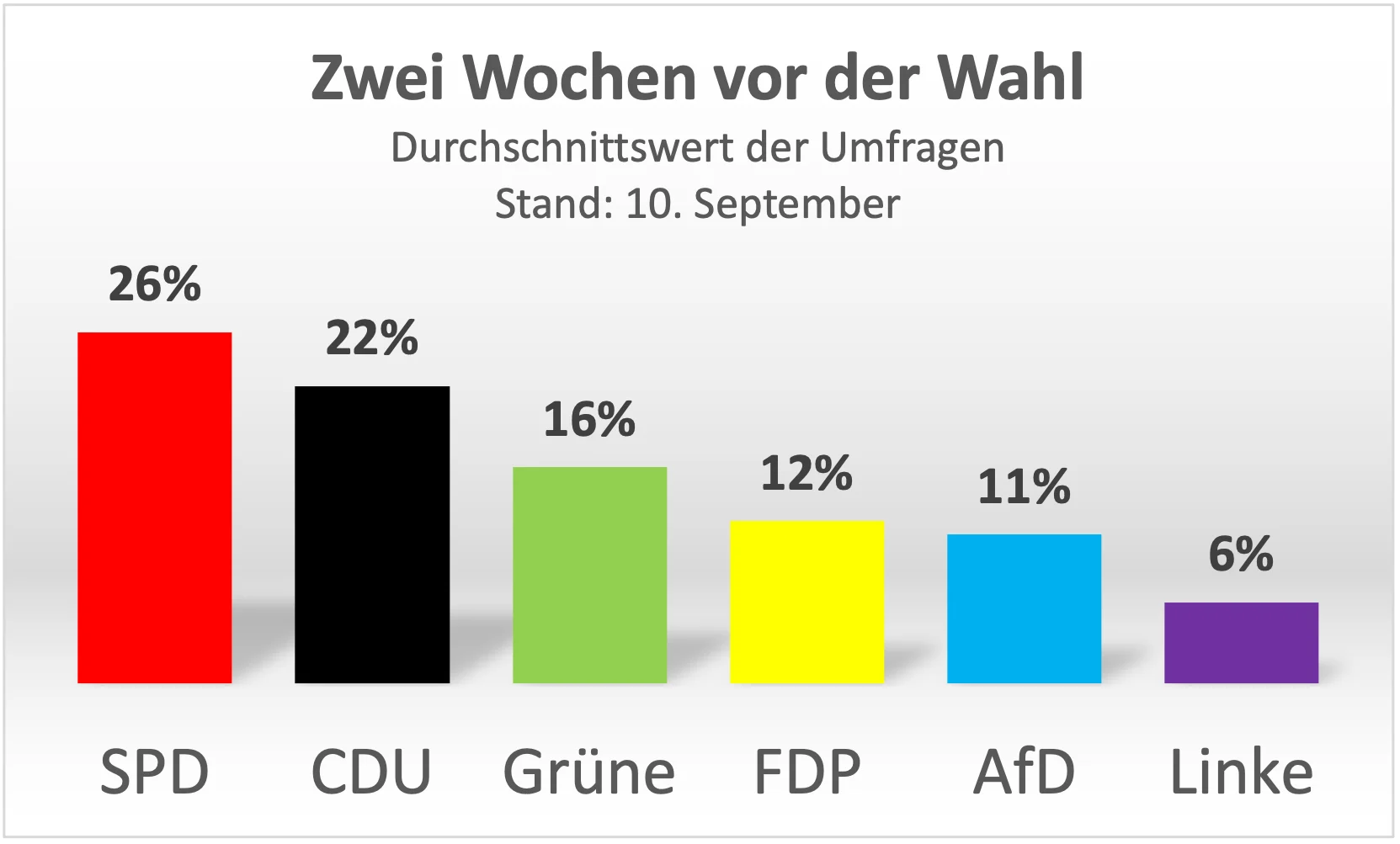 Meinungsforscher betonten vor dem Triell, dass das Rennen offen sei. Meinungsumfragen seien nur eine Momentaufnahme und keine Prognose. Das betont vor allem die zurückliegende CDU. Die SPD hingegen behauptet, ausnahmslos alle Umfragen zeigten seit Wochen einen klaren Trend, der auf einen Sieg der SPD hinweise. Der Wahltag wird zeigen, wer recht bekommt.