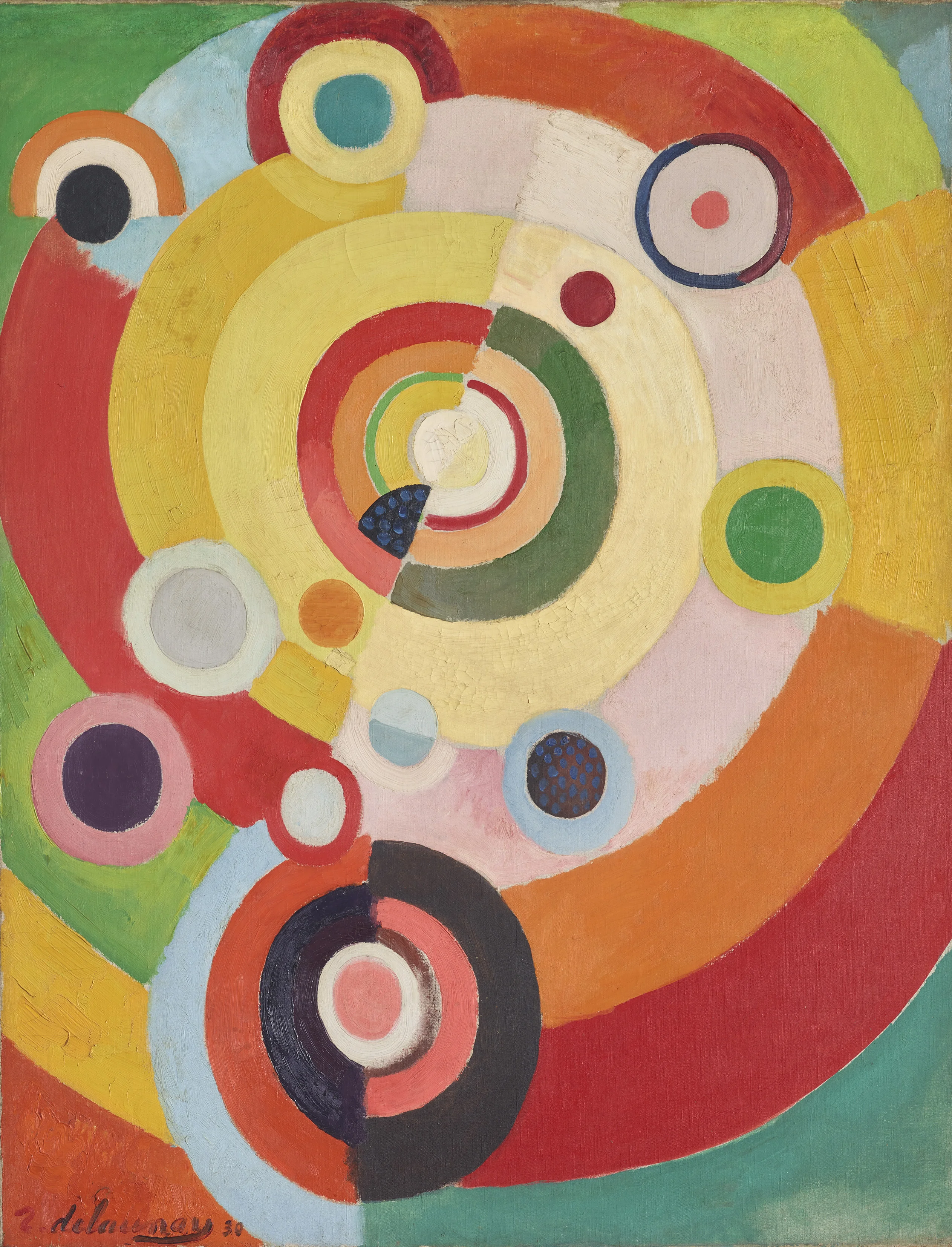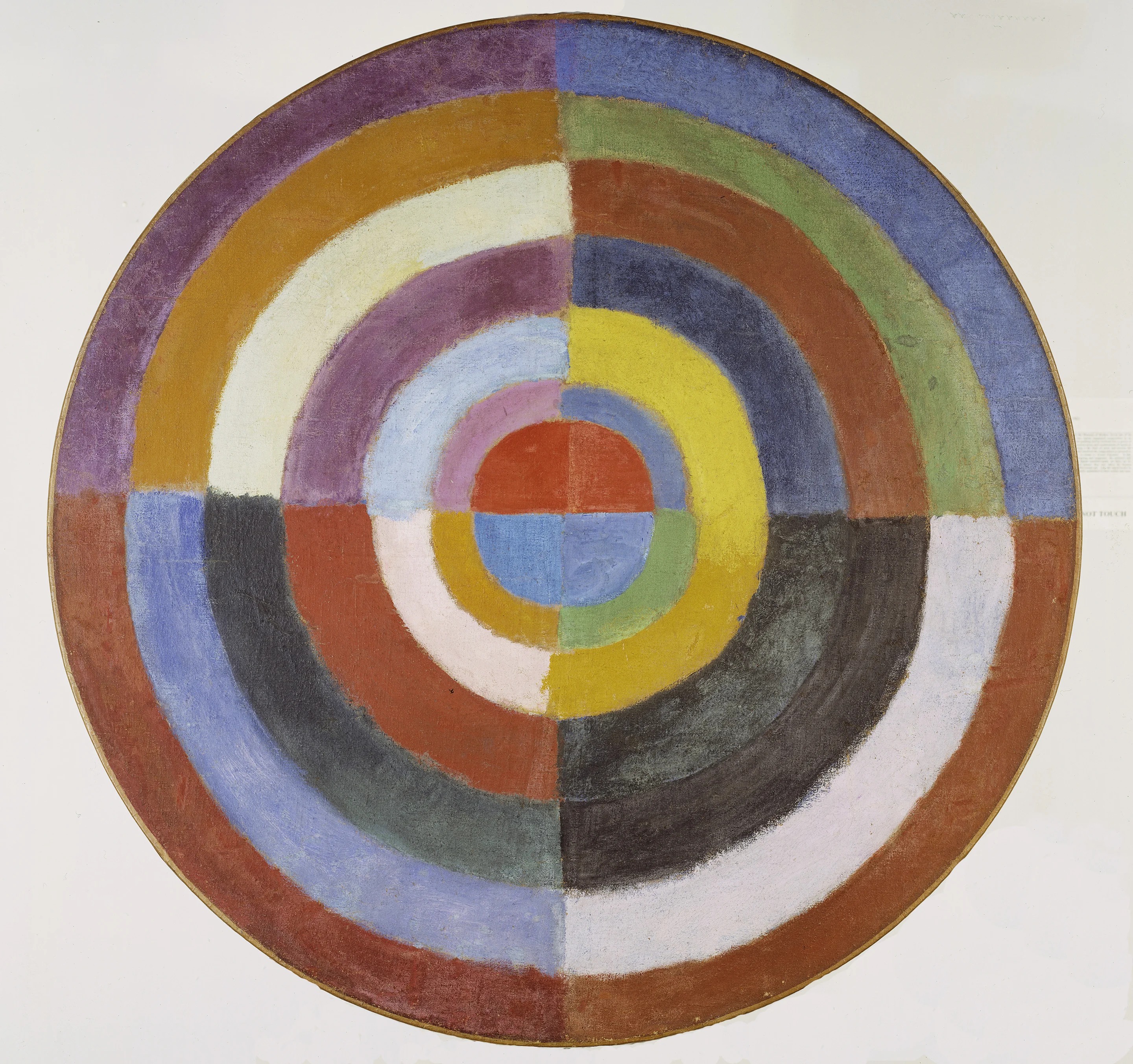 In den frühen 1910er-Jahren beginnt die Malerei sich von jedem Bezug zu realen Gegenständen zu lösen. Delaunay steht im Kontakt zu Kandinsky, dem Pionier dieses Epochenschritts, vollzieht aber den Übergang zur Abstraktion auf ganz eigenständige Weise. Sein „Disque“ von 1913 ist ein radikal einfaches, aufs Elementare reduziertes Bild: regelmässige Kreisringe, die in vier Sektoren geteilt und je monochrom ausgemalt sind aufgrund einer Farbentheorie, die für den Betrachter kaum zu entschlüsseln ist.