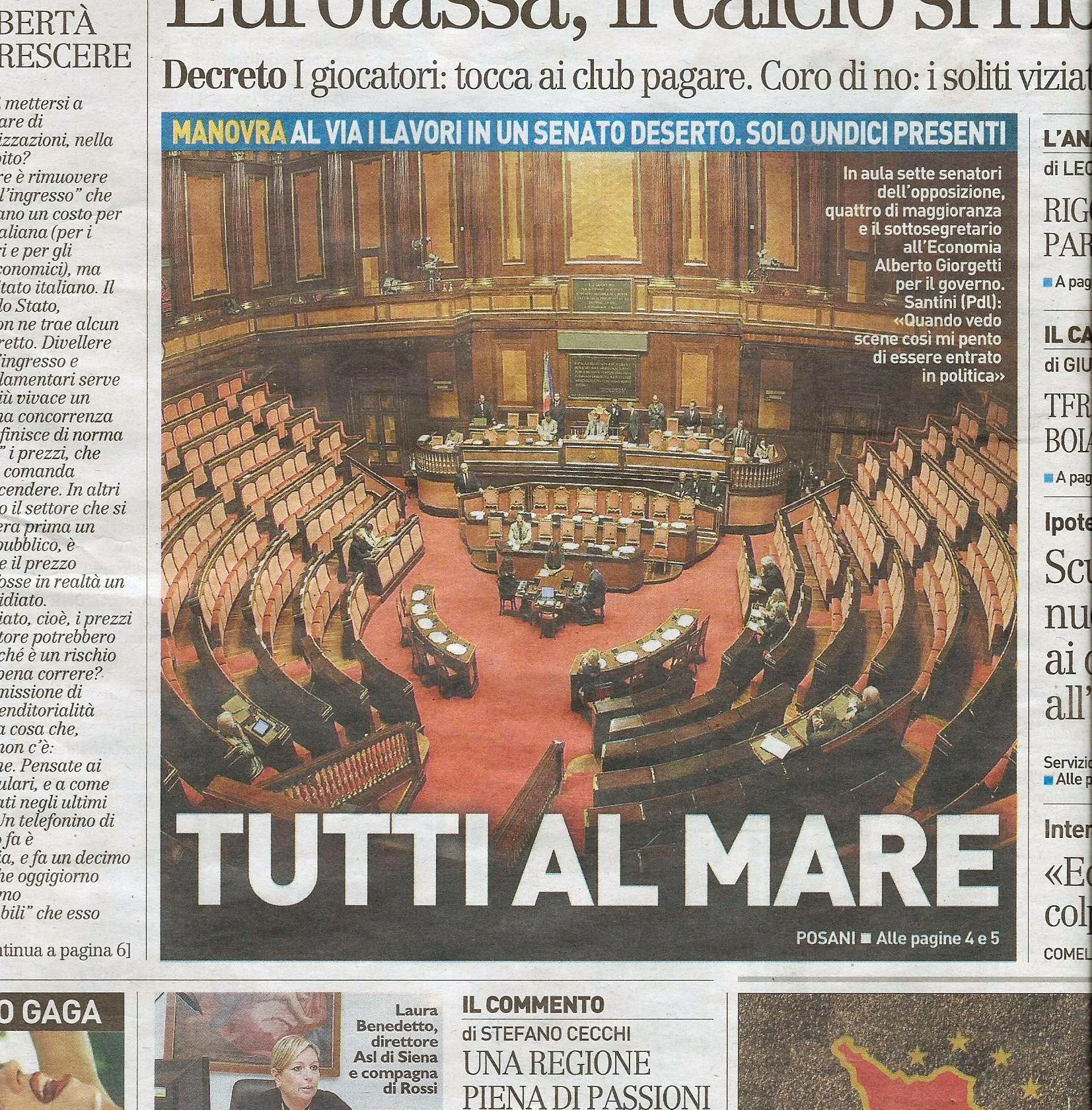 Trotzdem: der fast leere Senat wirft ein schiefes Licht auf den italienischen Politbetrieb. Er ist für viele eine Bestätigung dafür, was sie immer glaubten: „Die Politiker kümmern sich um sich selbst und nicht um das Volk.“ Gerade in der jetzigen angespannten Situation, in der viele Italiener echte wirtschaftliche Probleme haben, wirken solche Bilder wie Hohn.