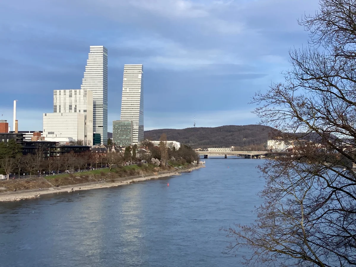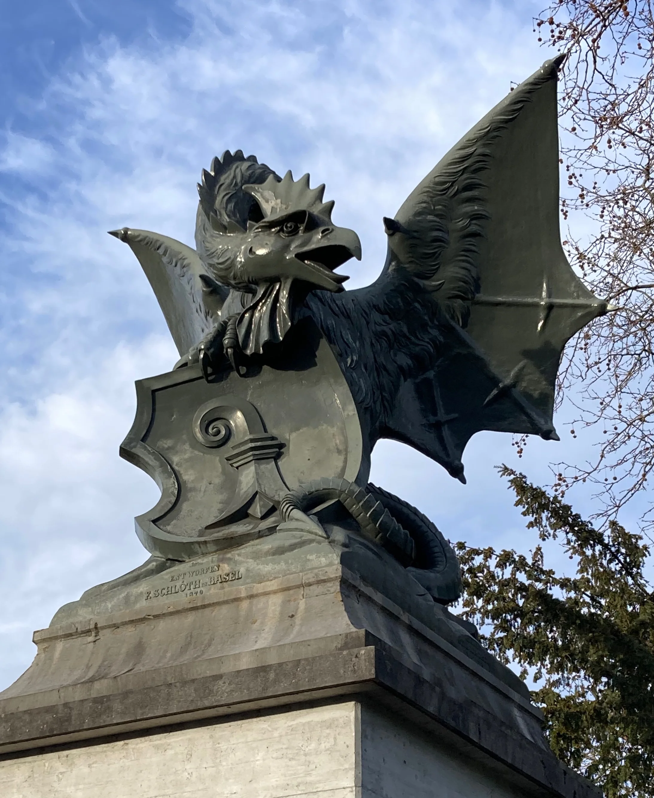 Für heute lasse ich das «Tiss» links liegen, folge der Elisabethenstrasse, passiere den Bankverein – Basel lässt sich diesen Namen nicht nehmen, auch wenn der Bankverein heute UBS heisst und seit kürzestem die einzig verbleibende Schweizer Grossbank ist –, gehe am Kunstmuseum vorbei, am Hauptbau aus dem Jahre 1936, dann am Neubau von Christ & Gantenbein (2016), und schon stehe ich am Anfang der Wettsteinbrücke, wo man einem der vier Basilisken, welche einst die 1879 eingeweihte erste Wettsteinbrücke zierten, in einer Nische am Strassenrand quasi als Entschuldigung für den Verkauf seiner drei Brüder Asyl gewährt hat. Hinter dem geflügelten Drachen ragen die Roche-Türme in den Himmel. Ihnen verdankt Basel offenbar die Bezeichnung «Hochausstadt».