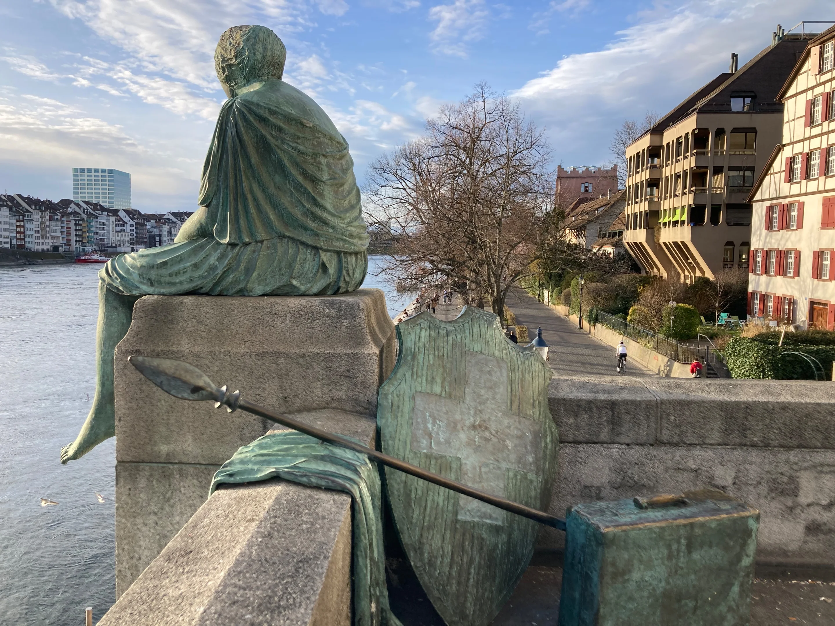 Mein letzter Besuch auf meinem ganz persönlichen Basler Nostalgiespaziergang gilt einer Frau. Sie sitzt am rechten Brückenkopf der Mittleren Brücke. Ihren Umhang hat sie abgelegt, Schild und Speer lehnen hinter ihr an der Balustrade, daneben steht ein kleiner Koffer. Die von Bettina Eichin geschaffene Helvetia schaut sehnsüchtig flussabwärts, dem fliessenden Wasser nach; sie denkt ans Meer, an ferne Länder, die sie, der Enge ihres helvetischen Goldkäfigs entfliehend, kennen lernen möchte. – Wie kann ich es ihr nachfühlen, dieses Ziehen in der Brust, das man Fernweh nennt. Nichts weckt es stärker, weder ein Wanderweg, noch eine Landstrasse oder ein Schienenstrang, als das fliessende Wasser eines mächtigen Stromes.
