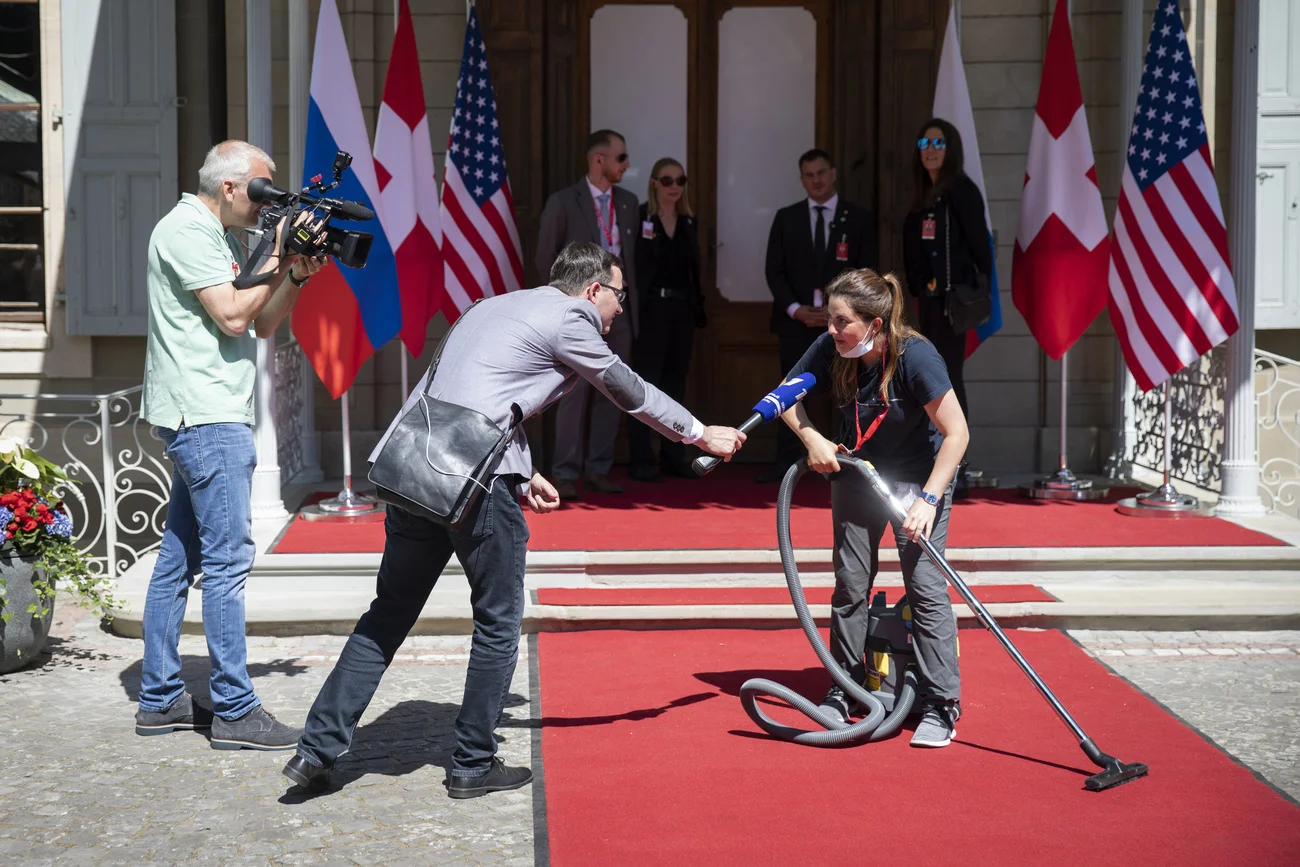 Mehrere hundert Journalisten aus der ganzen Welt verfolgten das Gipfeltreffen in Genf. Der Pont du Mont-Blanc ist zur Begrüssung der beiden Staatschefs mit 24 amerikanischen und russischen Fahnen geschmückt.