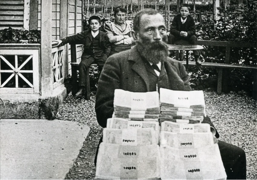 1890/91 erstellt Franz Josef Bucher einen Abschnitt der elektrischen Trambahn von Genua. Aus dem Verkauf löst er eine Million Franken. Das Geld erhält er in bar. Im Triumphgefühl seines finanziellen Erfolgs lässt er sich in Kerns mit den Notenbündeln im offenen Koffer fotografieren: der erste Obwaldner Millionär! Das Foto macht Furore – und führt gleichzeitig zum definitiven Bruch mit seinem Kompagnon Josef Durrer. Von nun an gehen sie getrennte Wege: Bucher kümmert sich um die Bahnen und Hotels, Durrer übernimmt die holzverarbeitenden Betriebe.