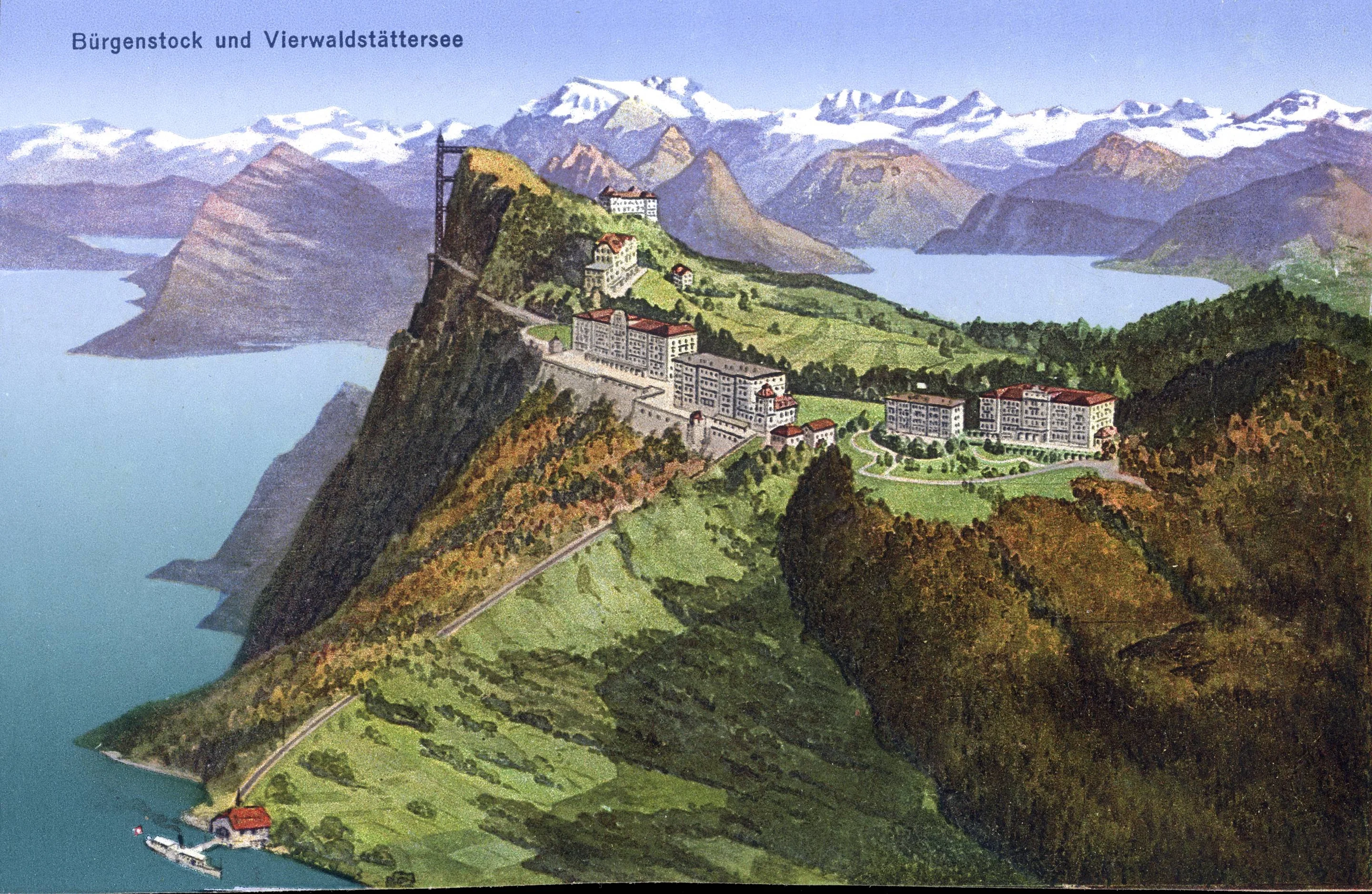 Die Dynamik des Unternehmerduos Bucher & Durrer zeigt sich auch auf der Alp Tritt. Das Idyll heisst nun Bürgenstock. Hier eröffnen sie 1873 ein Kurhotel, das spätere «Grand-Hotel» – an einmaliger Lage und mit faszinierender Aussicht auf Berg und See. 1888 baut Bucher mit der Bürgenstockbahn von Kehrsiten am Vierwaldstättersee her die erste rein elektrisch betriebene Standseilbahn. 1904 folgt das Hotel Palace, ein Jahr später der abenteuerliche Felsenweg mit dem Hammetschwand-Lift. Der Bürgenstock wird zum weltbekannten Luxusferienort. (5)