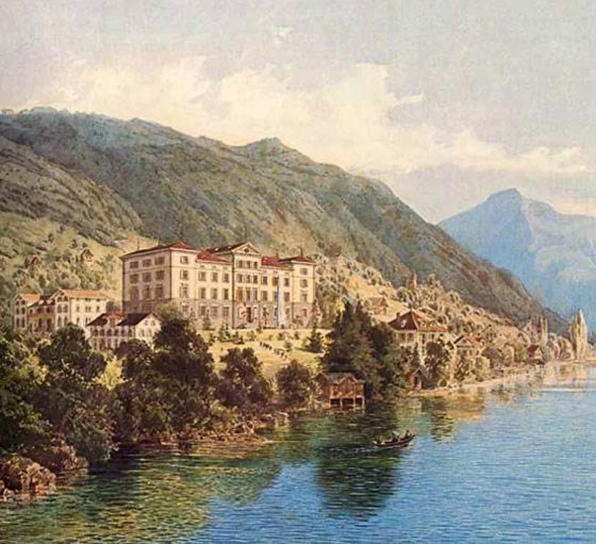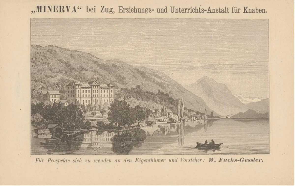 1870 entsteht etwas ausserhalb der Stadt Zug eine private Knabenschule. Errichtet wird ein eindrücklicher Schulpalast im neoklassizistischen Stil. Dazu gehört auch eine Turnhalle – die erste im Kanton Zug; dazu zählen Spielplätze, eine Allee und ein weiter Park mit Springbrunnen, Grotten und einem Weiher. Das Areal reicht bis zum See. Die Gotthardbahn existiert noch nicht. Erst 1897 durchschneiden ihre Geleise die weitläufige Grünfläche dieser herrschaftlichen Schulanlage.
