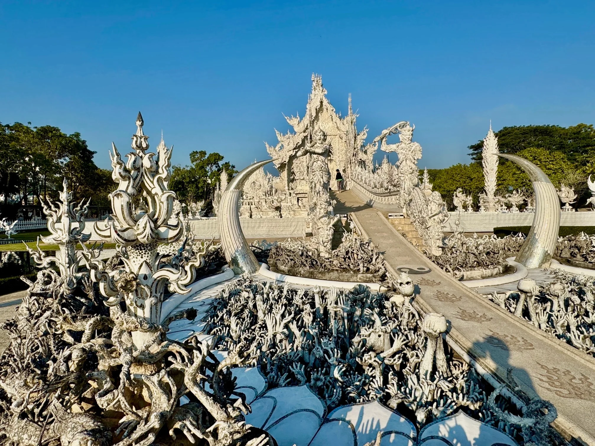 Dass Chalermchai den gesamten Umbau des Tempels, in den bis anhin zwölf Millionen Dollar investiert wurden, weitgehend aus seinem eigenen Vermögen finanzierte, deutet doch darauf hin, dass zu seinem Kundenkreis viele aus der Oberschicht zählen. Das Areal des Weissen Tempels – offiziell Wat Ron Khun – ist riesig und umfasst zahlreiche Gebäude. Am markantesten und auch am häufigsten fotografiert ist die Buddhahalle, zu der eine Rampe hinaufführt und hinter der sich ein Turm erhebt. Man blickt zu Beginn auf ein Meer von Händen hinunter, die für die Unersättlichkeit menschlicher Triebe stehen und somit den Weg zum Glück verbauen. Zwei Elefantenstosszähne zeigen eine Art Tor an.