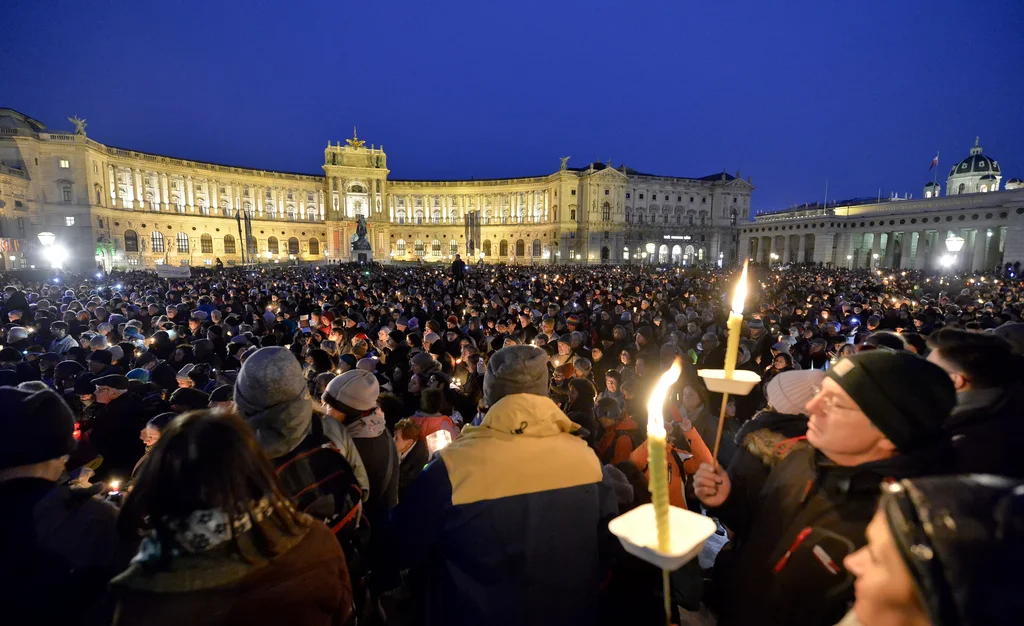 Der Aufmarsch auf dem Heldenplatz war auch ein Protest gegen die restriktive Flüchtlingspolitik der neuen österreichischen Regierung. Kritiker werfen ÖVP-Bundeskanzler Sebastian Kurz vor, unter dem Druck der rechtspopulistischen FPÖ mehr und mehr eine unmenschliche Flüchtlingspolitik zu betreiben. „Wir wollen mit dieser Demonstration ein Zeichen setzen“, erklärten die Manifestanten. (Foto: Keystone/APA/Herbert Neubauer)