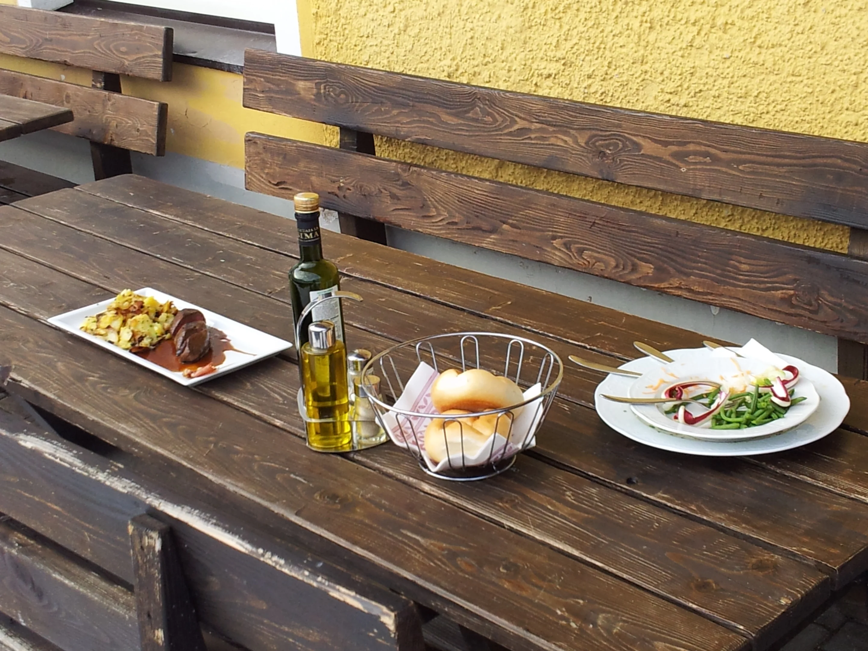 Sie bestellt offensichtlich Essen für draussen. Dort stehen auf der Sonnenseite vier Holztische und Bänke. In der Winterzeit ist es hauptsächlich der Ort der Raucher, mancher nimmt dort einen Café und ein Stück Kuchen .