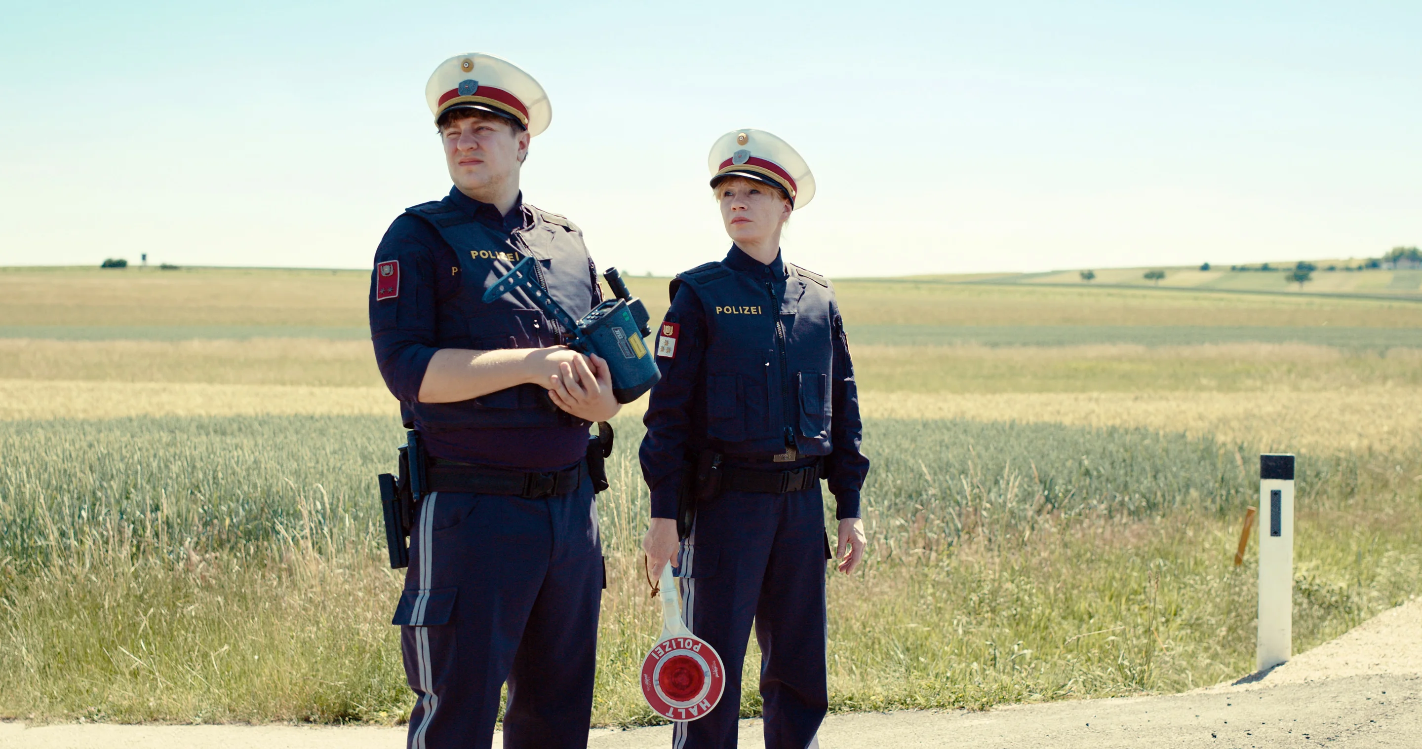 Am Horizont erscheint zunächst winzig klein ein Polizeiauto, es fährt heran und parkiert. Ihm entsteigen die Beamtin Andrea und ihr Dienstkollege Georg. Offensichtlich stehen Geschwindigkeitskontrollen an, ein Routinejob.