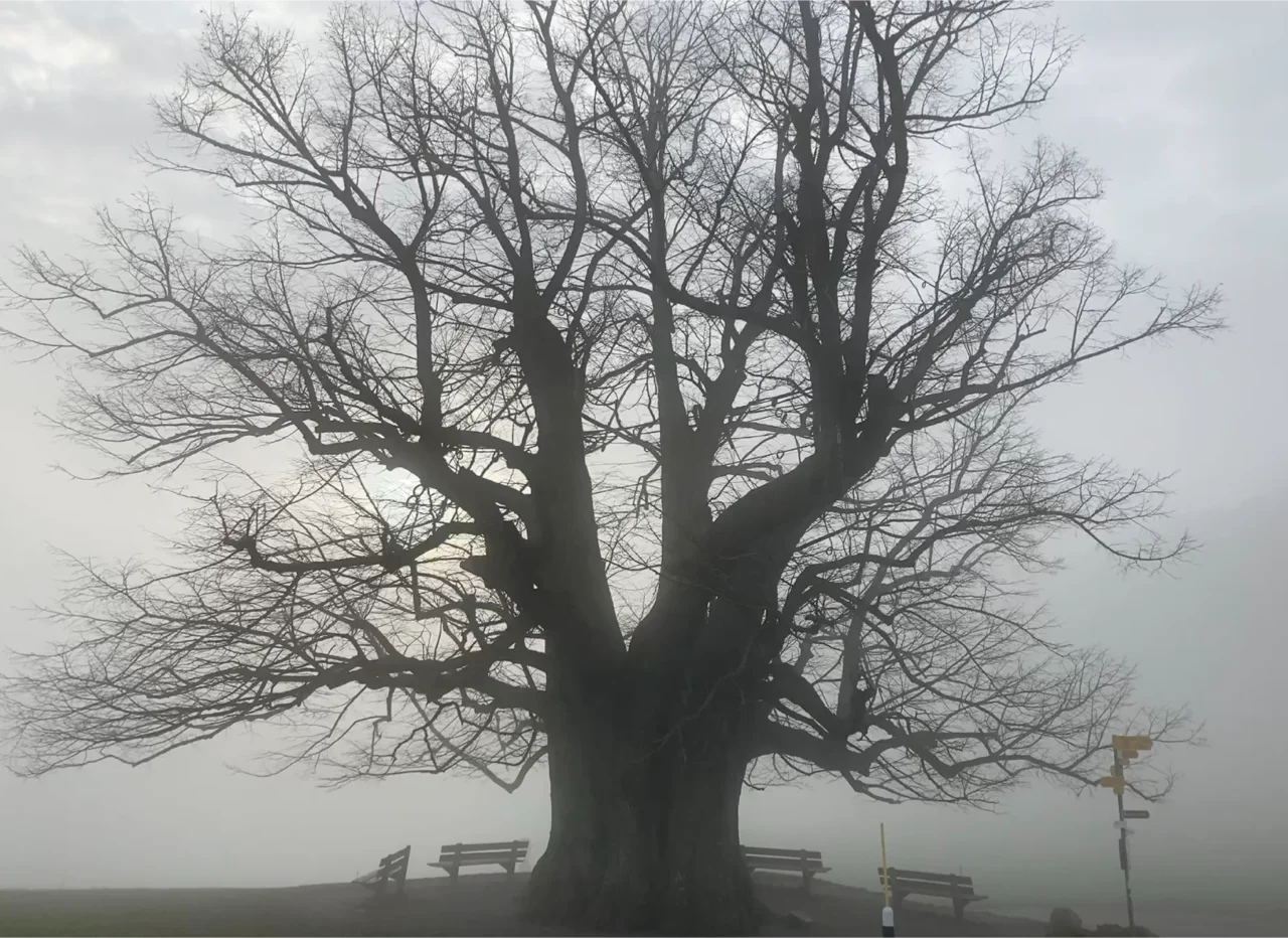 Ein feiner Nebelschleier liegt über der Geländemulde, in der sich das kleine Dorf duckt, als wir das Auto auf dem Parkplatz am Dorfeingang abstellen. Der mächtigste Baum im Kanton Aargau erinnert mit seinen kahlen Ästen vor dem milchig-weissen Hintergrund ein bisschen an einen mehrarmigen Buddha. Die Linner Linde, 25 Meter hoch und mit einem Stammumfang von elf Metern, sei zum Gedenken an die Pest, welche im 16./17. Jahrhundert in der Gegend wütete, von einem überlebenden Bewohner gepflanzt worden, sagt die Legende. Doch tatsächlich ist die Sommerlinde (Tilia platyphyllos) viel älter. Sie wird auf rund 800 Jahre geschätzt.
