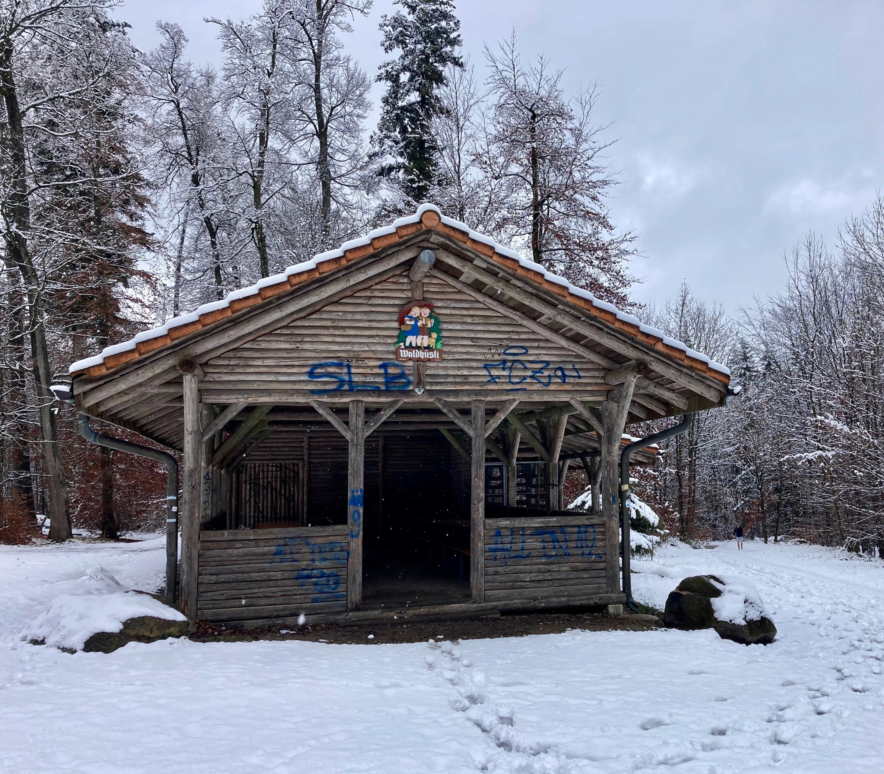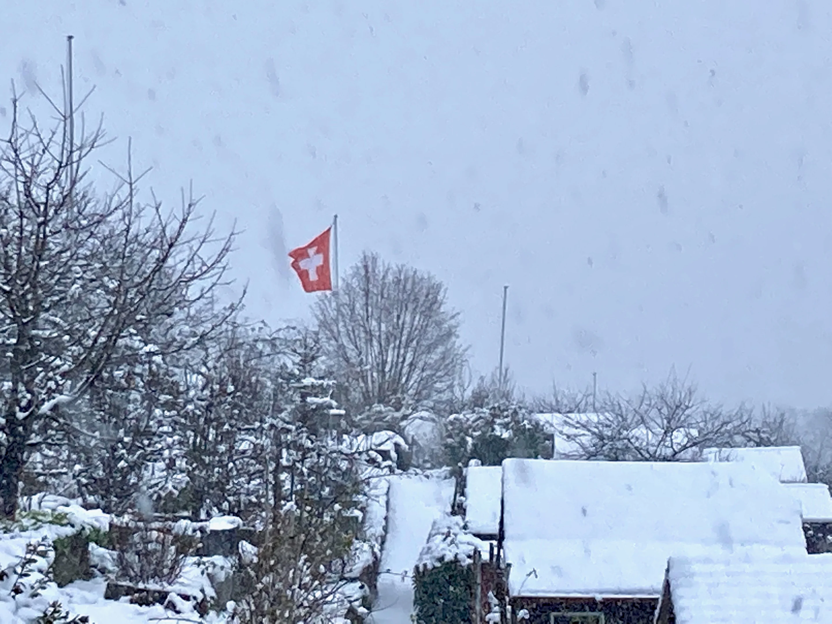Nichts Einfacheres als das: Am Waldrand, wo der Hanslinweg zur HInterbergstrasse wird, liegt das Areal des Familiengartenvereins Susenberg: Was kann es Friedlicheres geben als Schrebergärten? Die Schweizer Fahne über dem Gelände, welche sich von der dunklen Schneewolke, die jetzt vom Uetliberg her auf mich zutreibt, nicht beeindrucken lässt, kommt mir für einen kurzen Moment vor wie ein tapferer Eidgenosse vor dem heranrückenden Feind.