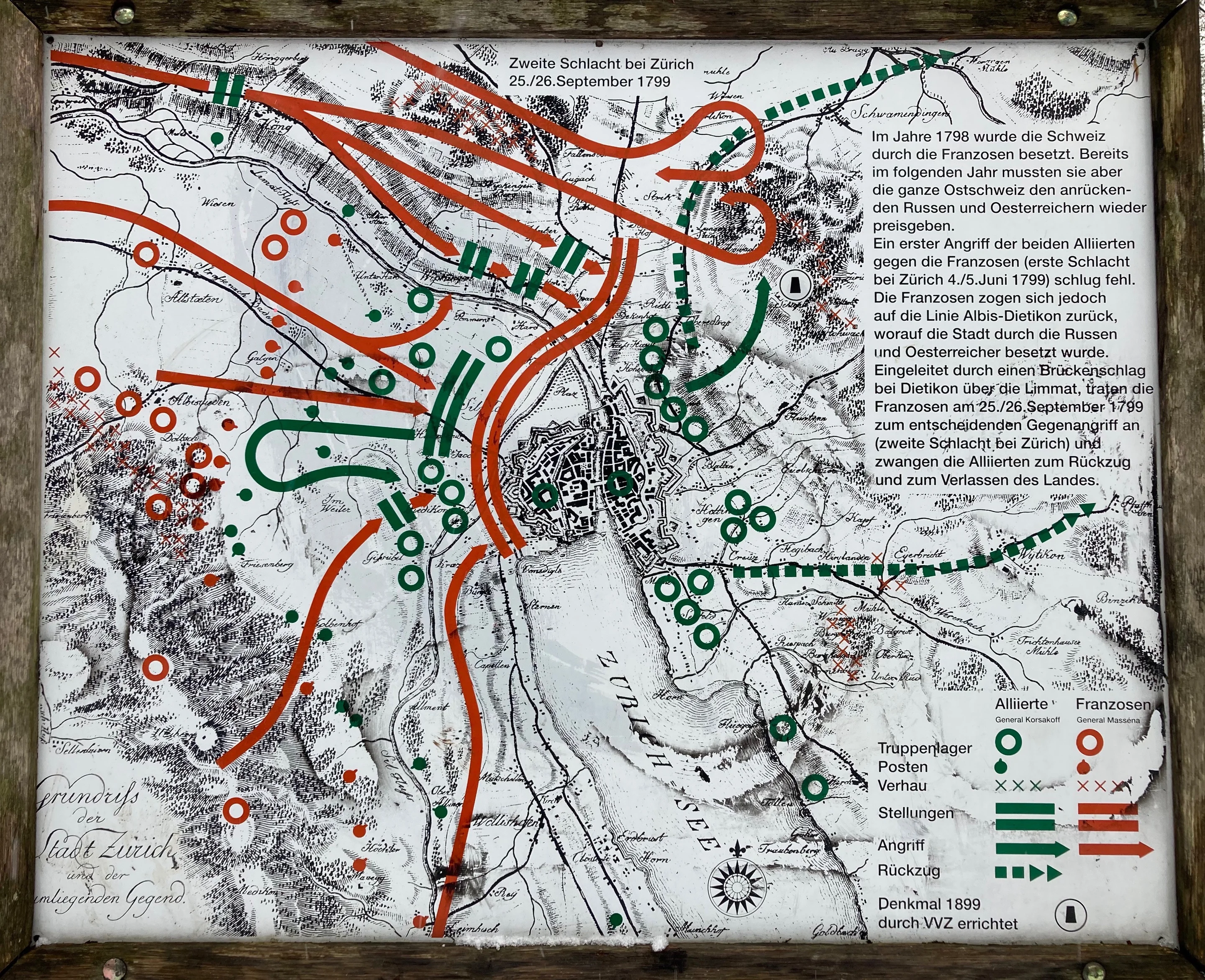 «Kanonendistanz» kommt mir darum in den Sinn, weil ich unterdessen den steilen Weg zur Batterie hinaufgehe, wo einst die Kanonen zum Schutz der Stadt standen, gute 250 Höhenmeter über dem See. Überhaupt scheine ich mich in der militärischen Ecke des Zürichbergs zu befinden, denn etwas südöstlich davon stosse ich auf den Hanslinweg, benannt nach Adolf Hanslin (1911–1971), dem einstigen Korpskommandanten der Schweizer Armee. Ferner steht dort seit 1899 ein Denkmal, das an die Schlachten bei Zürich vom Juni und September 1799 erinnert. «Was, Krieg in der Schweiz?», höre ich Father Christmas sagen, was mich daran erinnert, dass unsere MEEM-Schaltung noch immer aktiv ist, «ich habe doch einst gelernt, die Schweizer hätten seit Marignano niemals mehr Krieg geführt.»