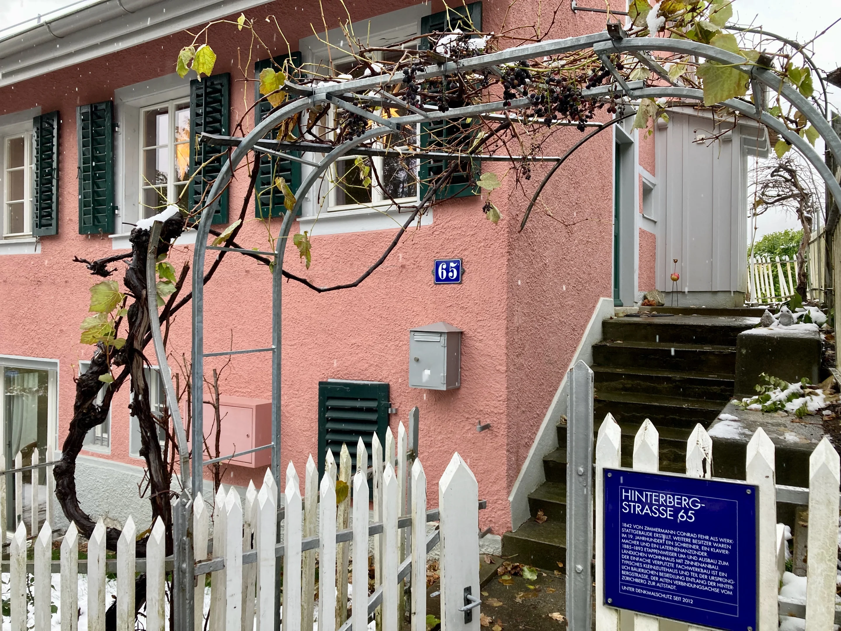 Auf ihr bin ich über Mittag oft auf und ab gewandert und habe dabei an archäologische Schichtfolgen gedacht: Unterhalb der Schrebergärten stehen die neuen Villen, weiter gegen die Stadt sind es die älteren Bürgerhäuser und schliesslich zuunterst an der Limmat die Häuser der Altstadt. Nur dass die Schichten im Laufe der Zeit etwas durcheinandergeraten sind, denn am Hang des Zürichbergs standen schon im 19. Jahrhundert einzelne Gebäude. Einige davon haben wie erratische Blöcke überlebt, als in den 1920er Jahren die Villen der reichen Zürcher wie eine steinerne Brandung gegen den bisher ländlichen Susenberg heranzurollen begannen. Ein Beispiel für Letzteren ist die Nummer 65 – heute unter Denkmalschutz –, wo 1842 der Zimmermann Conrad Fehr seine Werkstatt eingerichtet haben soll.
