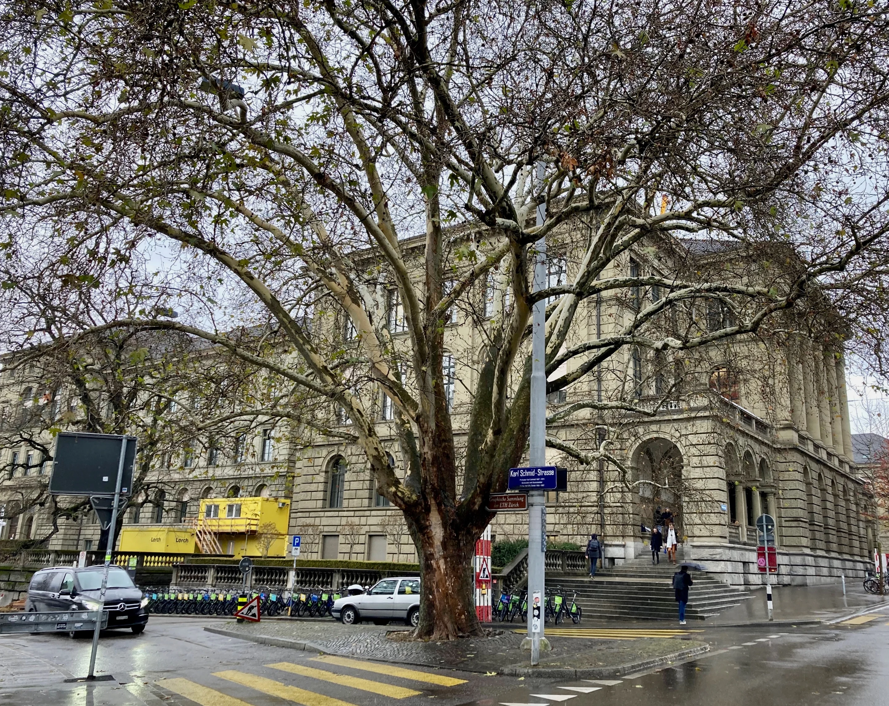 Auf der Karl-Schmid-Strasse zwischen ETH und Universität bleibe ich für einen Moment stehen und erkläre Father Christmas, dass K. S. als Germanist an der ETH gelehrt habe und später ihr Rektor gewesen sei. Der Name der Strasse sei daher ein Symbol dafür, dass die benachbarten Weltspitzen-Hochschulen gemeinsam über die grossen Herausforderungen der Zukunft forschen würden, über Armut und Hunger, Klima und Umwelt, Krieg und Frieden, Gesundheit und soziale Gerechtigkeit.