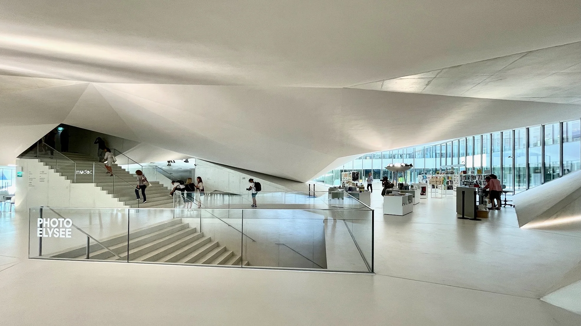 Formal fügt sich der Kubus der Gebrüder Aires Mateus, der sowohl das MUDAC wie das Photo Elysée beherbergt, als Fluchtpunkt bestens in die Gesamtkomposition ein. Er bietet sogar die grössere Ausstellungsfläche an als das MCBA, und doch trumpft er nicht auf dieselbe Weise auf. Das hat damit zu tun, dass ein Grossteil des Volumens vom Platz aus nicht erkennbar ist. Zu sehen ist vorerst lediglich ein über einem quadratischen Grundriss errichteter Block, der die Eingangshalle und das über das Dach belichtete Obergeschoss für das MUDAC umschliesst. Ein unregelmässiges, durchgehendes Fensterband lässt den oberen Teil des in hellem Sichtbeton ausgeführten Körpers schweben.
