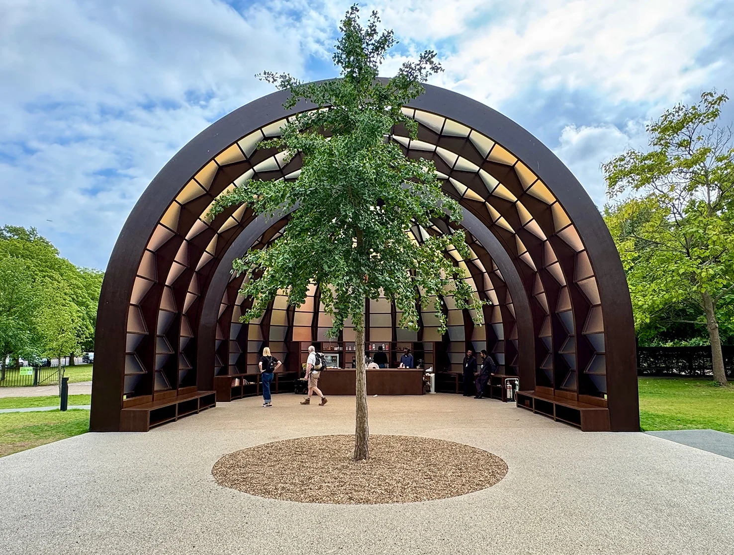 Die Grossform des Pavillons ist wohltuend klar und deutlich. Insgesamt vier Teile konturieren eine Halle, die jedoch durchlässig ist, einmal durch eine Lücke, einmal durch ein bewegliches Element. In der Mitte steht ein Ginkgo-Baum, ein biologisch altertümliches Gewächs, das mit seiner langen Geschichte als Art die zeitliche Beschränktheit jedes Bauwerkes bezeugt. Die zwei mittleren Elemente – bestehend aus Bögen, die direkt aus dem Boden wachsen – werden an beiden Enden von konchenartigen (muschelförmigen) Abschlüssen eingefasst. Ausgefacht wird das Holzskelett mit opaken, im Zickzackmuster gefalteten Kunststoffplatten in dezent bräunlich-gelblichen Tönen. Wie bei den vergangenen Pavillons waren zwei Anforderungen zu beachten: Es muss eine Bar eingebaut werden und es muss genügend Platz für kulturelle Anlässe vorhanden sein.