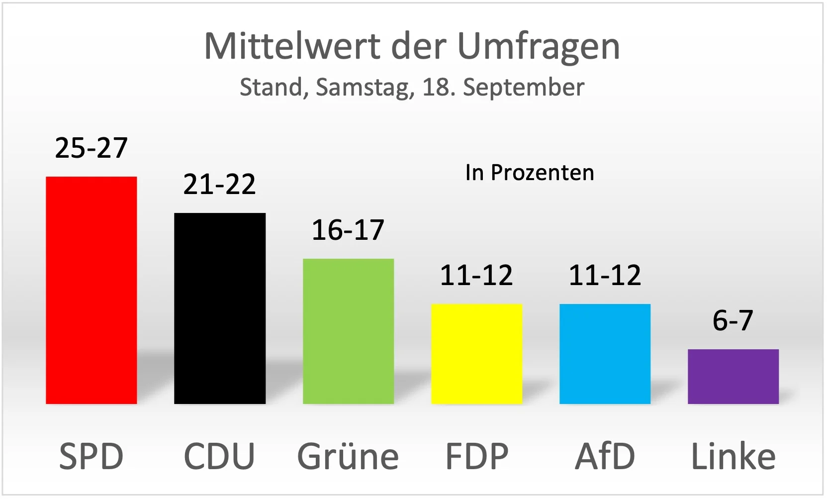 Gemäss letzten Umfragen kann die SPD ihren Vier- oder Fünf-Prozent-Vorsprung auf die CDU halten. Die Institute betonen immer wieder, dass dies keine Prognose für die Wahlen sei, sondern eine Bestandesaufnahme zur Zeit der Umfrage.