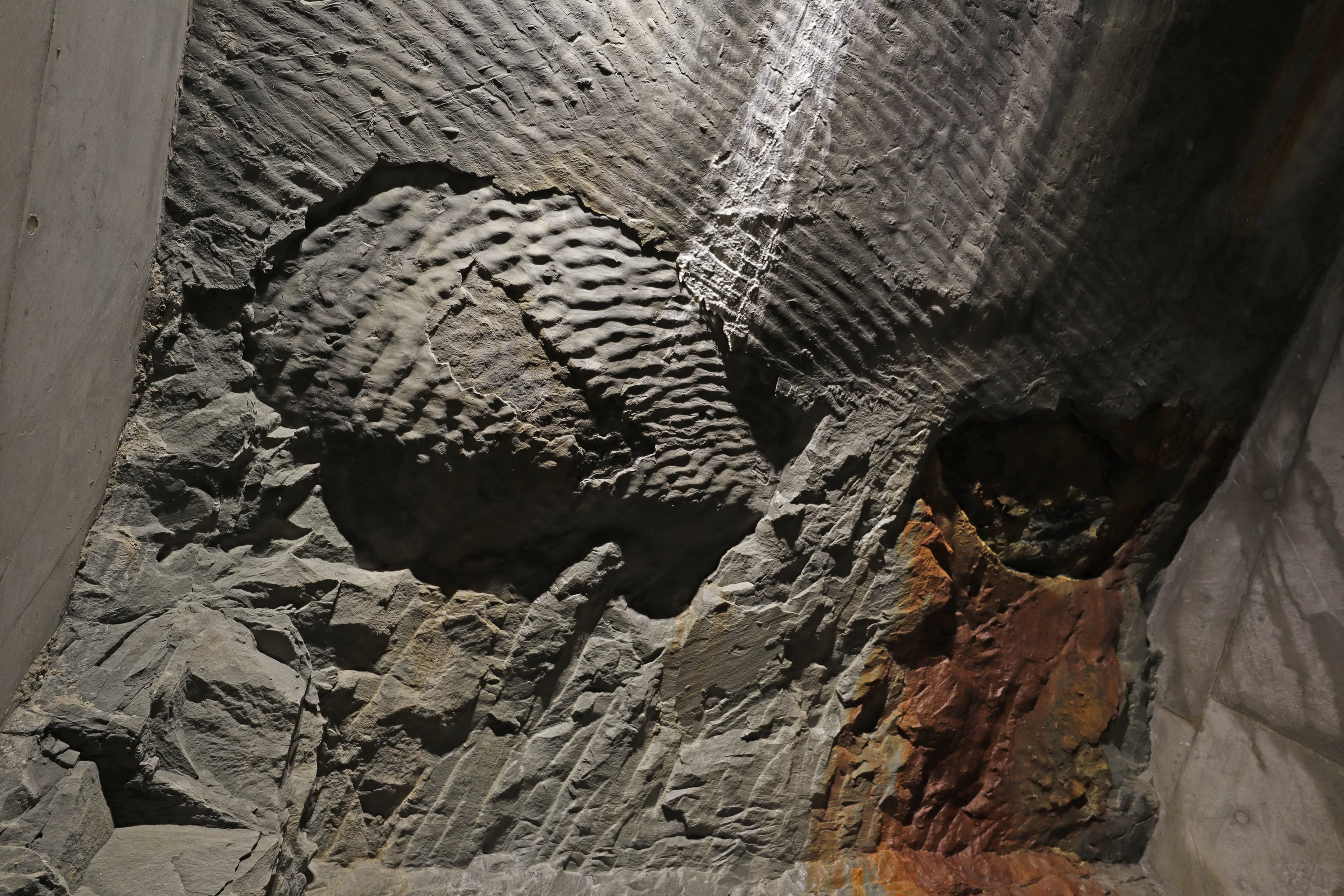 Erfahren lässt sich sehr konkret, dass Erdgeschichte nicht ein abgeschlossenes Faktum ist, sondern auch heute Veränderungen mit sich bringt. Hier ist eine braune Verfärbung durch eisenhaltiges Wasser zu bemerken, dort setzen sich der Feuchtigkeit wegen Algen an, dort wiederum bilden sich Kalkablagerungen: Die „Felsenwelt“ wird sich weiterhin und nicht einmal so langsam verändern. Knapp unter der Erdoberfläche entdecken wir – als sei es ein archäologischer Blick aus der Zukunft in unsere Gegenwart – „versteinerten“ Plastikmüll. Das Erzählen der geologischen Geschichte des Ortes umfasst auch die Entstehung der Beton-Architektur: Davon berichten Bohrlöcher, Metallklammern, Musterungen der Holzverschalungen oder hier und dort roh belassene Betonoberflächen.