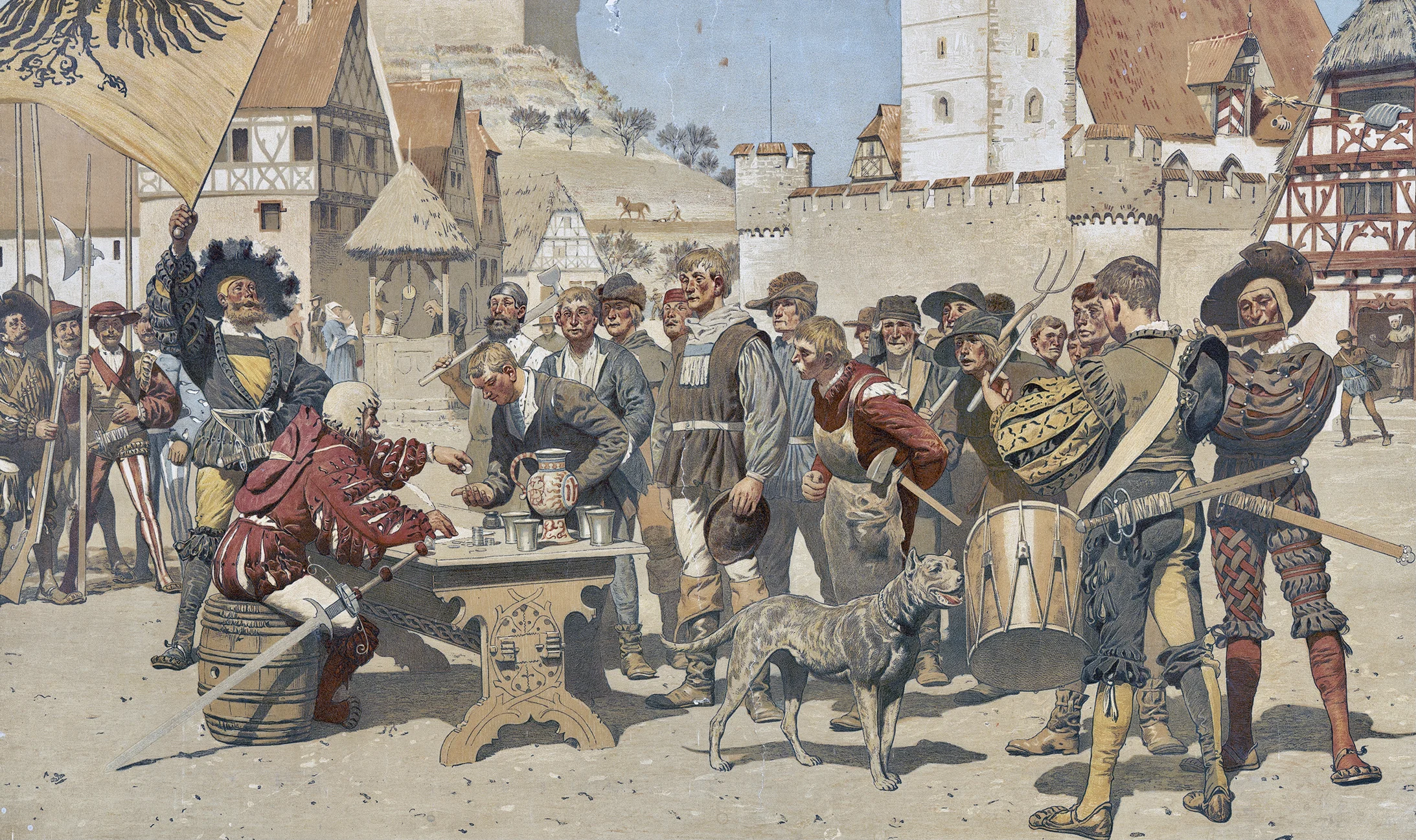 Auf dem Dorfplatz steht ein Tisch. Ein Landser schlägt die Trommel. Am Tisch sitzt ein Anwerber. Mehrere junge Männer melden sich zum Söldnerdienst in fremden Landen. Wer unterschreibt, erhält ein Handgeld – und einen Becher mit Wein.