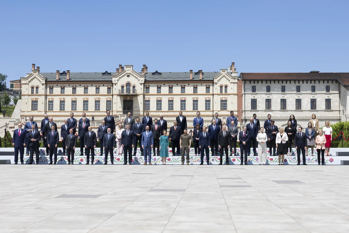 Nahe der moldawischen Hauptstadt Chişinău bekunden 45 europäische und vorderasiatische Staats-und Regierungschef ihre Solidarität mit der Ukraine und der Republik Moldau. In der Mitte vorne im Bild der ukrainische Präsident Wolodymyr Selenskyj und die moldawische Präsidentin Maia Sandu. Vertreten ist auch die Schweiz mit Bundespräsident Alain Berset (obere Reihe sechster von links, hinter Giorgia Meloni).