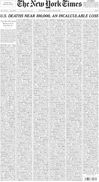 „Fast 100’000 Tote“ titelt die wichtigste amerikanische Zeitung. „Ein unermesslicher Verlust“. Die Aktion wird als Kritik an der Corona-Politik von Präsident Trump gedeutet.