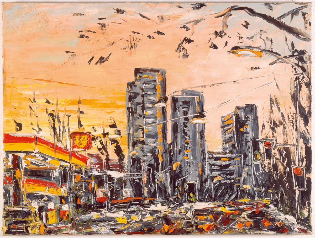 Aus der Verlegenheit, vorübergehend kein Atelier zu haben, schnallte sich Schnyder die Staffelei auf den Rücken und erkundete auf dem Rennvelo die städtische und vorstädtische Szenerie im Bern der frühen 1980er Jahre. Die klein- bis mittelformatigen Ölbilder sind malerische Stenogramme dieser visuellen Bestandsaufnahme, rasch gepinselt in einer flüchtigen, aber leicht leserlichen Handschrift. Schnyder will, dass der Betrachter die Szenen wiedererkennt: So sieht das also aus bei uns!