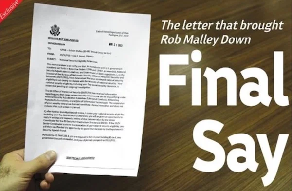 Nur einen Monat später wurde Malley als Sondergesandter für den Iran in unbezahlten Urlaub versetzt, seine Sicherheitsfreigabe wurde aufgrund einer Untersuchung wegen möglichen Missbrauchs von Verschlusssachen ausgesetzt.