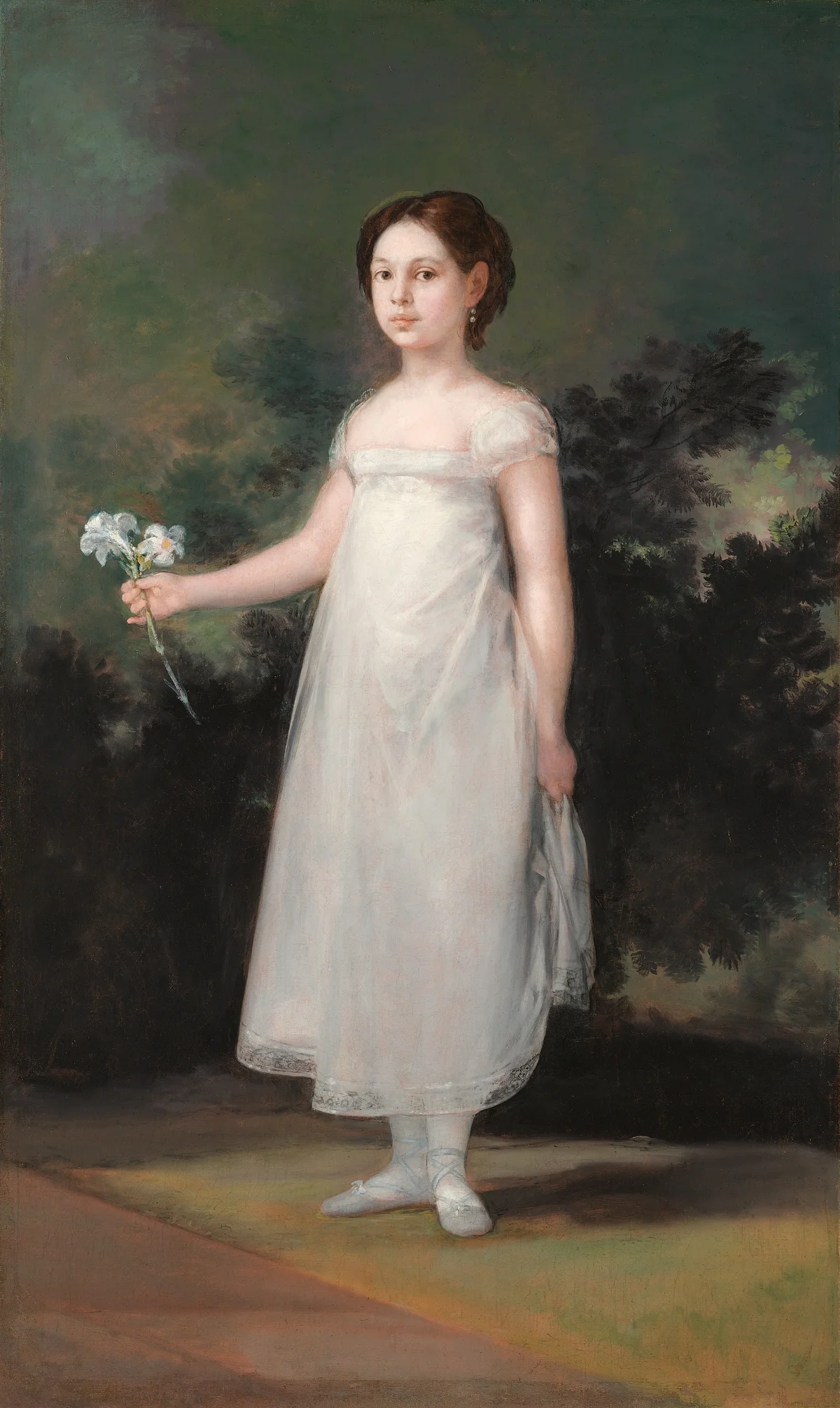 Im Bildnis der etwa zehnjährigen María Amalia de Aguirre y Acedo sind zwar alle Konventionen des Adelsporträts erfüllt: María Amalia trägt ein Kleid, das ihre Prädestination zur Braut signalisiert, und selbstverständlich gehört als Accessoire die weisse Lilie der sexuellen Unschuld dazu. Gleichwohl zeigt das Bild ein Kind, das in Haltung und Blick eine leise Unsicherheit angesichts dieses strikt vorgegebenen Lebens ausdrückt.
