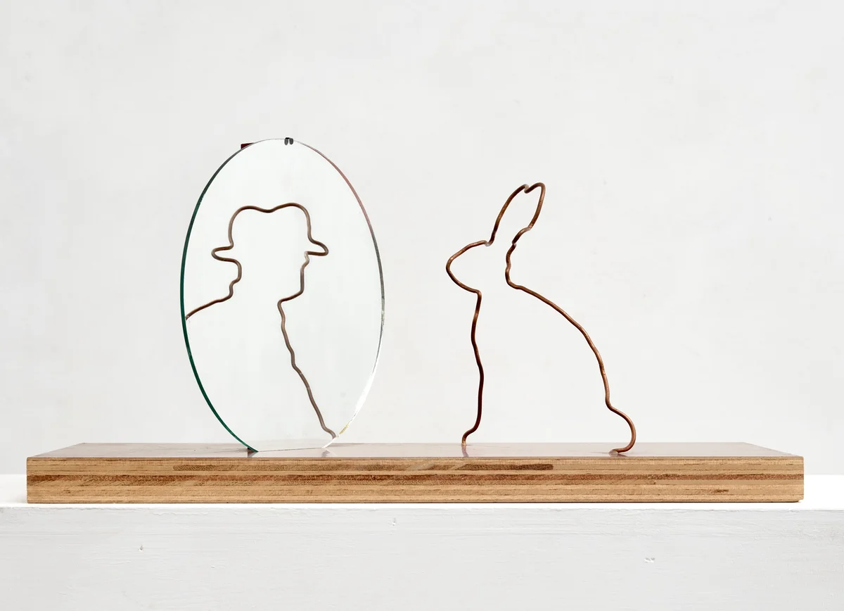 Markus Raetz‘ Werk handelt denn auch immer wieder vom Entstehen der Bilder im Kopf des Betrachters. Das zeigt sich in «Madame et Monsieur», das sich erst in unserer Bewegung im Raum, im Umschreiten des Werkes als Doppelbild erschliesst. Augenfällig wird das auch, wenn der Künstler sieben Bruyèrezweige auf den ersten Blick scheinbar disparat und wie zufällig an einer Wand anordnet. Ihre Positionen gehorchen aber genauen Überlegungen: Sie fügen sich zum Gesicht, wenn wir aus einem vom Künstler genau definierten Standpunkt aus in einen an der Wand befestigten Spiegel blicken («Reflektion», 1985–1988).