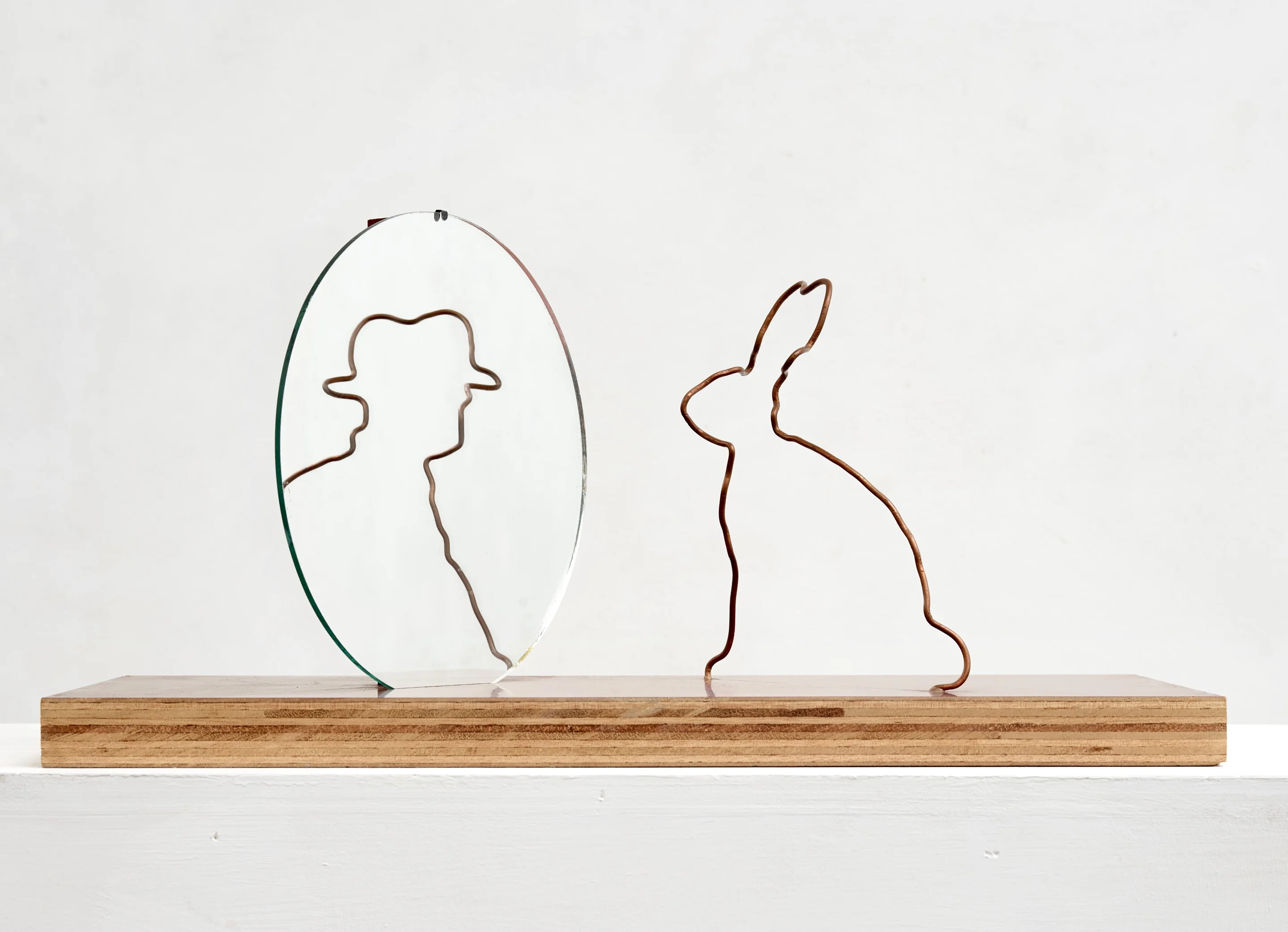 In Augenhöhe sind, auf einem Eichenholzbrett, zwei aus Eisendraht geformte Gebilde montiert. Was sie darstellen, erschliesst sich erst, wenn man um das Objekt herumgeht. Plötzlich werden die scheinbar willkürlich geformten Drähte zum Bild zweier Menschen: Wir sehen die Konturen einer adrett gekleideten Frau mit verschränkten Armen. Sie blickt einem Herrn in Anzug keck, vielleicht auch schnippisch in die Augen. Die Haltung des Mannes deutet Erstaunen an.