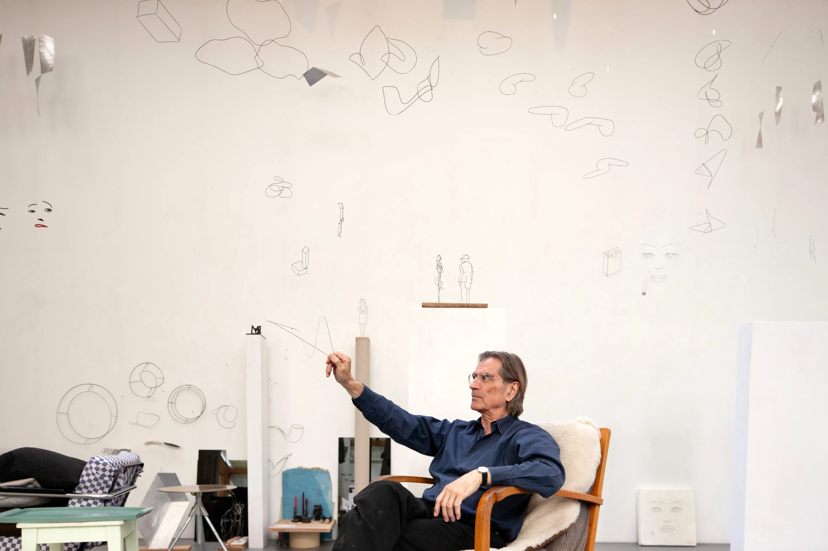 Im letzten Raum der Ausstellung ist einem Werk zu begegnen, das Markus Raetz selber nicht mehr vollenden konnte, dessen Ausgestaltung er aber in einer Skizze festhielt. Diese Skizze zeigt zahlreiche aus Drähten geformte Mobiles, die er zu einem im Raum frei hängenden Kegel zusammenfügt. Er skizziert sich selbst, in einem Stuhl vor dieser «Wolke» sitzend und ruhig in die sich überschneidenden und darum kam mehr einzeln lesbaren Drahtfiguren blickend. Diese Zeichnung – und ihre Umsetzung in der Berner Ausstellung – belegt jene tüftelnde Experimentierlust, die den Künstler sein ganzes Leben begleitete.