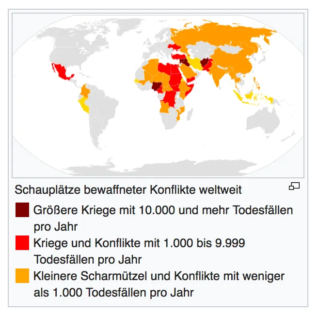 Die Tatsache, dass dauernd an vielen Orten der Welt Kriege und gewalttätige Konflikte bestehen, rückt an Weihnachten jeweils wieder stärker und schmerzlicher ins Bewusstsein. Derzeit sind es gemäss Arbeitsgemeinschaft für Kriegsursachenforschung (AKUF) der Universität Hamburg weltweit 32 Kriege (eine Liste der aktuell andauernden Kriege führt Wikipedia). – Die an Weihnachten gesteigerte Empfindlichkeit gegenüber Krieg und Gewalt ist ein Hinweis darauf, dass sich mit diesem Fest (teils kaum bewusste) Friedenswünsche verbinden, die durchaus über das traute Heim und das persönliche Wohlleben hinauszielen.