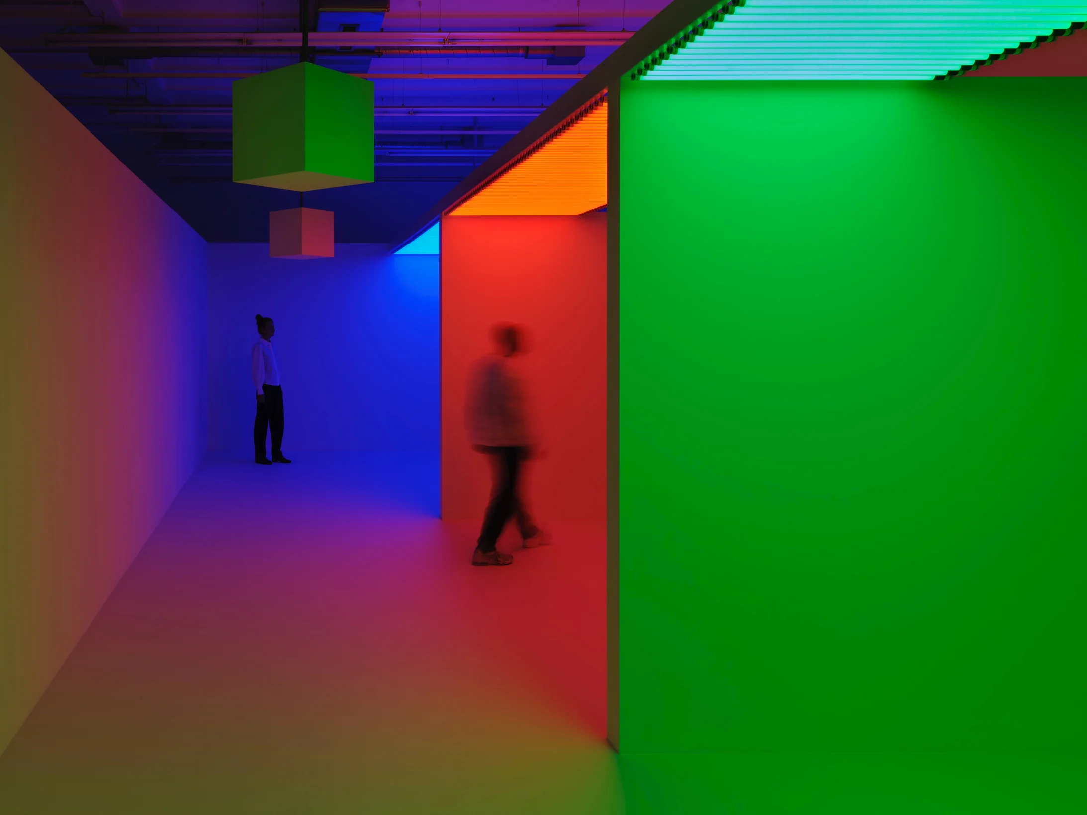 Nach zwei Ecken öffnet sich eine Folge von drei offenen Räumen, die von blauem, dann rotem und schliesslich grünem Licht geflutet sind. Verweilt man etwas in einem dieser Lichtbäder, so verändert sich die Farbwahrnehmung gleitend. Die Reflexe auf der gegenüber den drei Räumen verlaufenden Wand verschieben sich und die additiven Farbmischungen – Gelb zwischen Rot und Grün, Purpur zwischen Blau und Rot – treten deutlich hervor.